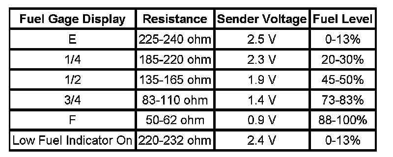 The information in this table is intended for use with the J 33431-C Signal Generator and Instrument Panel Tester. The fuel level sensor values represent the test values to be used on the Signal Generator to drive the fuel gage display to the indicated positions. Vehicles that require more than one fuel level sensor calculate gage position from many possible resistance combinations of fuel levels between the two tanks. Therefore, the values in the table may not correlate directly to readings taken from the vehicle primary or secondary sending units.