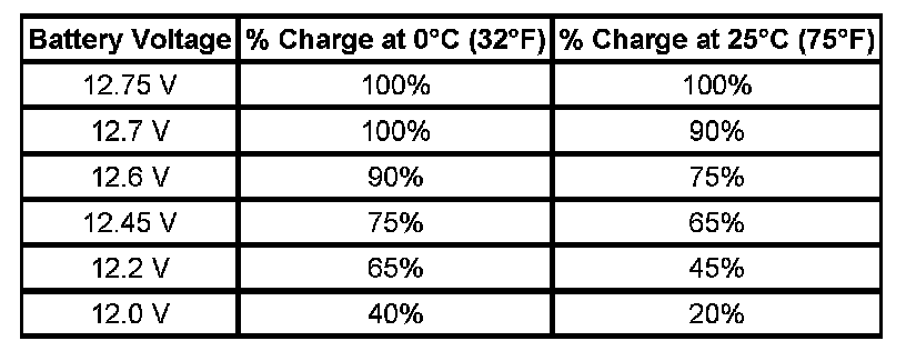 Important: Using voltage to determine the batteries state of charge (SOC) is only accurate after the battery has been at rest for 24 hours. This is enough time for the acid in each cell to equalize. If the battery has been charged or discharged in the past 24 hours, the battery SOC will only be an estimate.