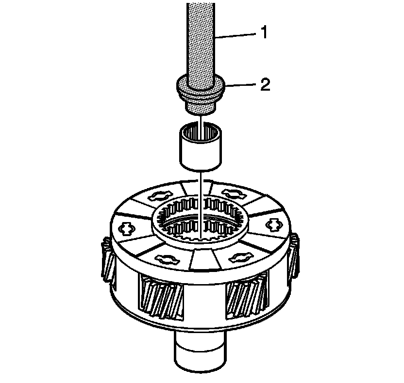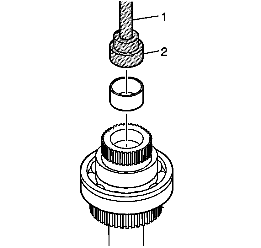 14. Using the J 42176 (1) and the J 45757 (2), install the mainshaft front support bearing in the high/low planetary carrier assembly.