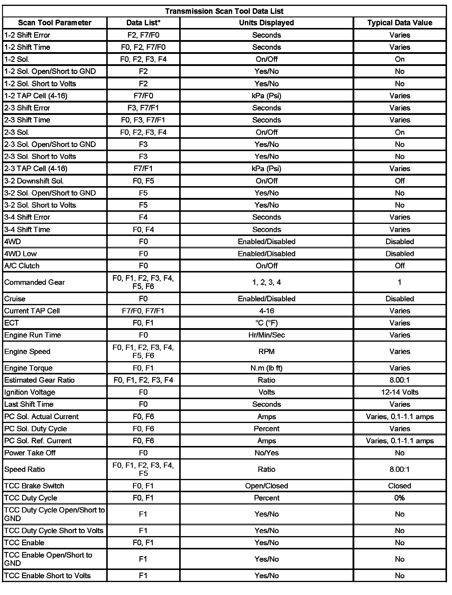 Only the parameters listed below are used in this manual for diagnosing. If a scan tool displays other parameters, the values are not recommended by General Motors for use in diagnosis.