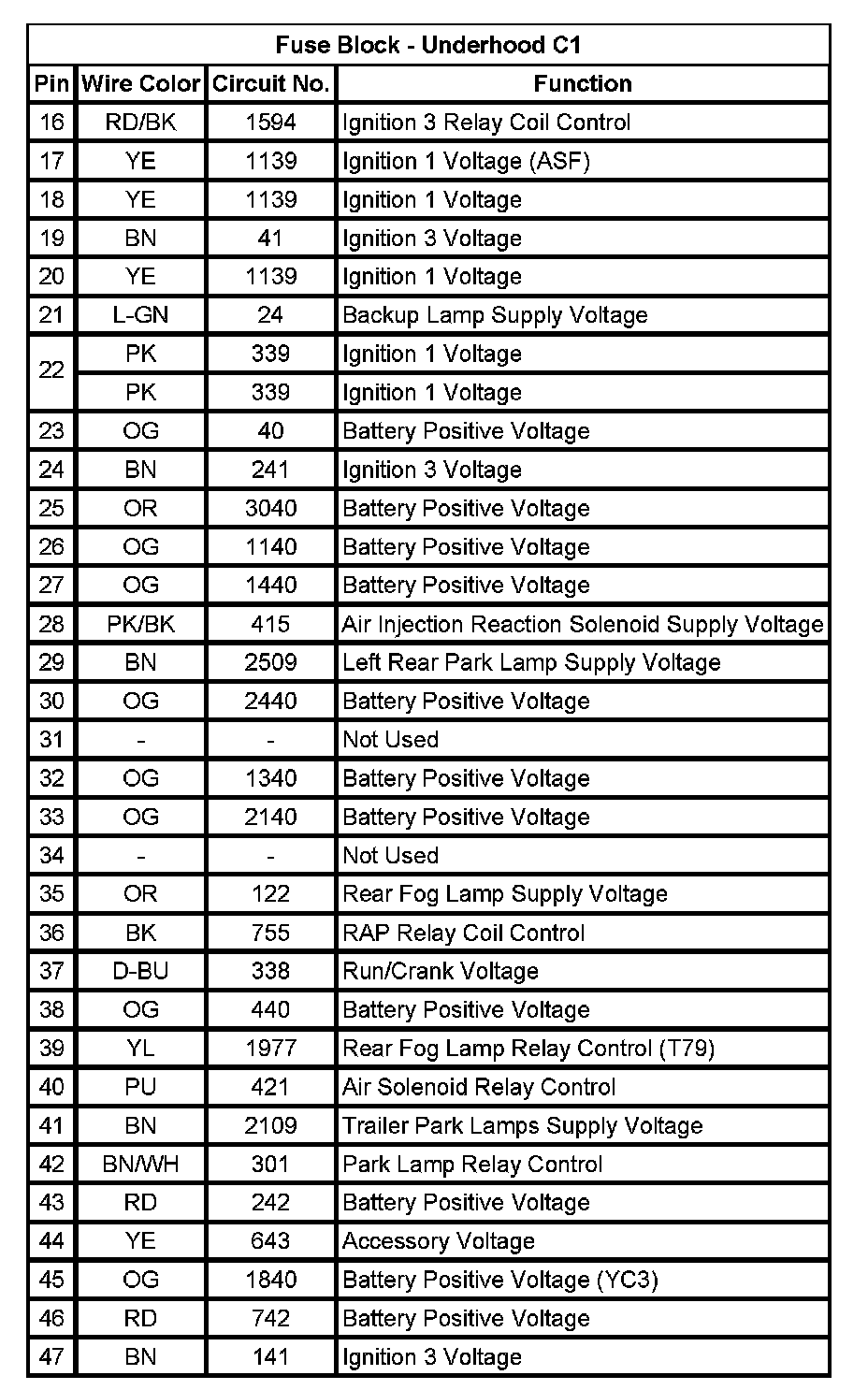 Fuse Block - Underhood C1 (Pin 16 To 47):