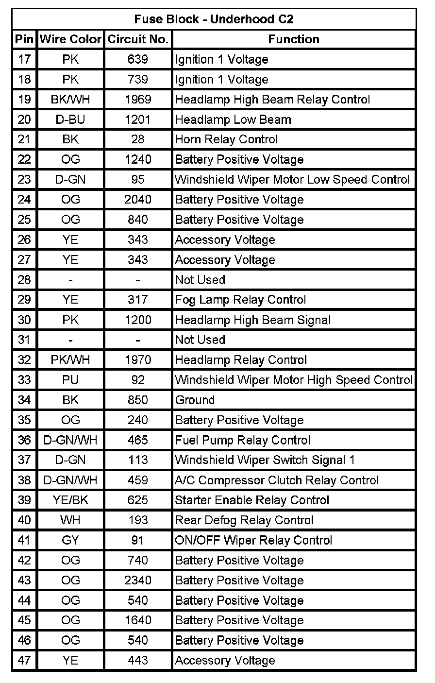 Fuse Block - Underhood C2 (Pin 17 To 47):