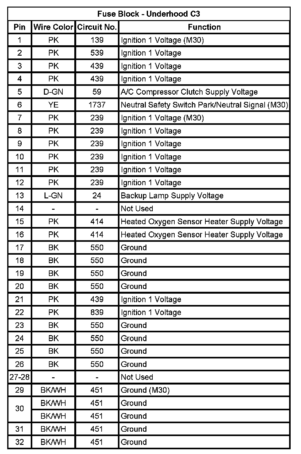 Fuse Block - Underhood C1 (Pin 1 To 15):