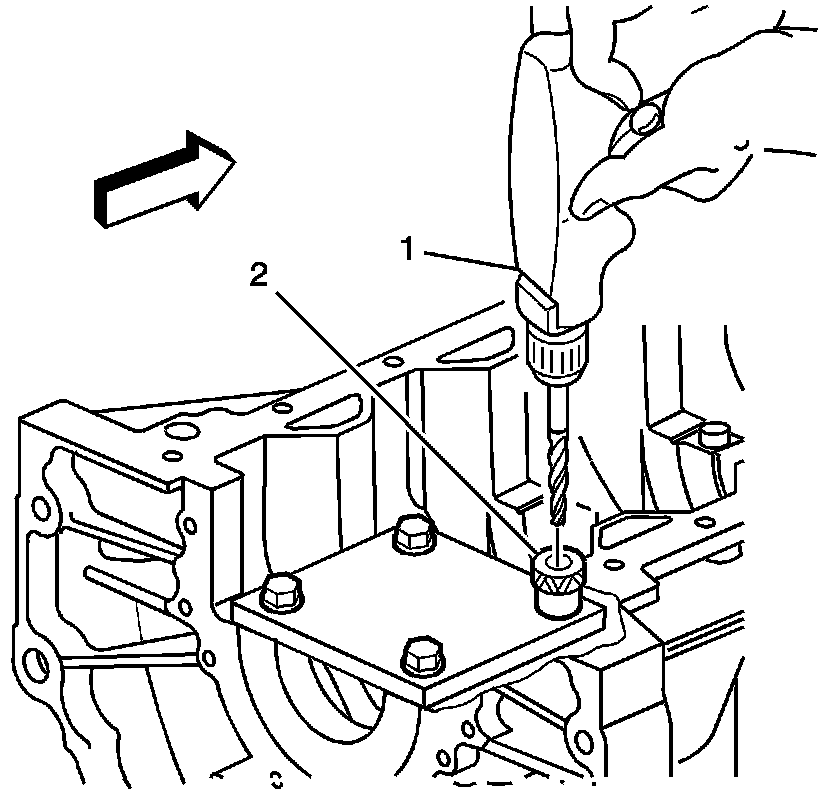 ^ Drill the crankshaft main bolt hole until the mark (1) on the drill aligns with the top of the drill bushing (2).