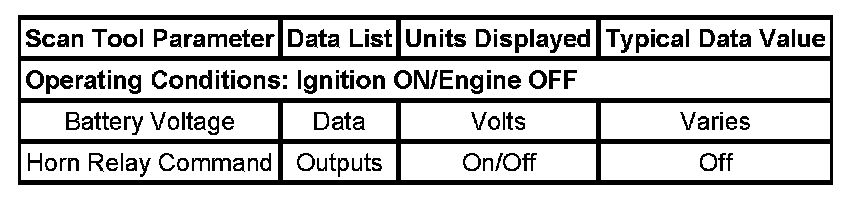 The Horns Scan Tool Data List contains all of the horn related parameters that are available on the scan tool. The parameters in the list are arranged in alphabetical order. The column, "Data List," indicates the location of the parameter within the scan tool menu selections. Use the Horns Scan Tool Data List as directed by a diagnostic table or in order to supplement the diagnostic procedures. Begin all of the diagnostic procedures with Diagnostic System Check - Vehicle. Diagnostic System Check - Vehicle