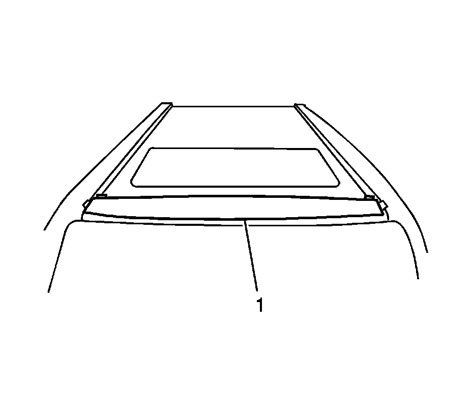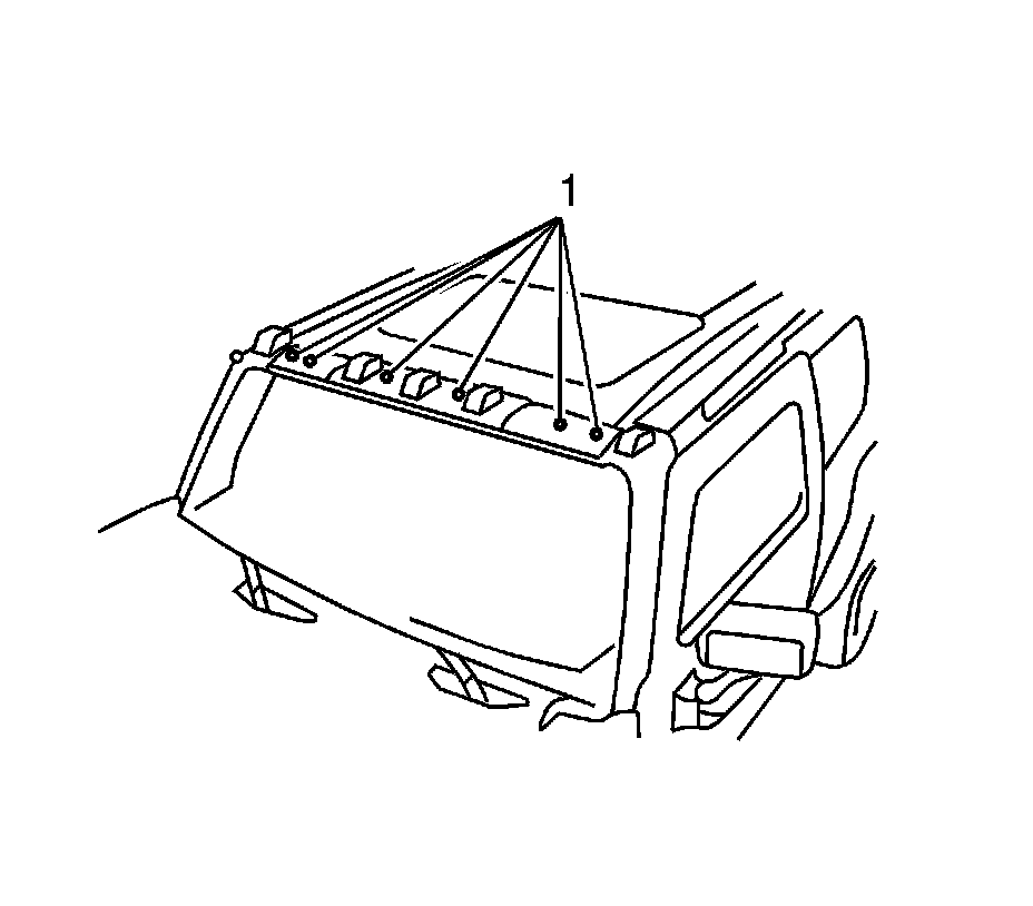 5. Center the template provided (1) on the roof between the two A-pillars. Position the template so that the front edge rests against the rear edge of the windshield reveal molding and tape in place.