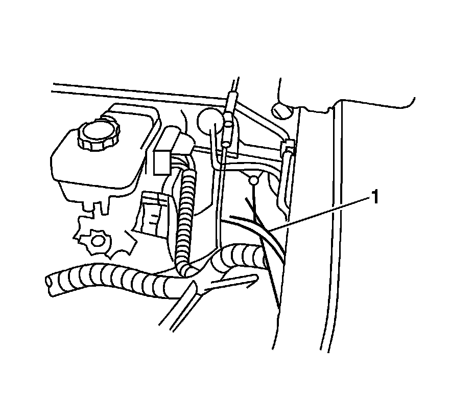 45. Locate the 6 blunt wiring cuts (1) in the engine compartment behind the driver's side wheelhouse. The engine compartment blunt cuts have seals on them that must be removed prior to using the splice sleeve.