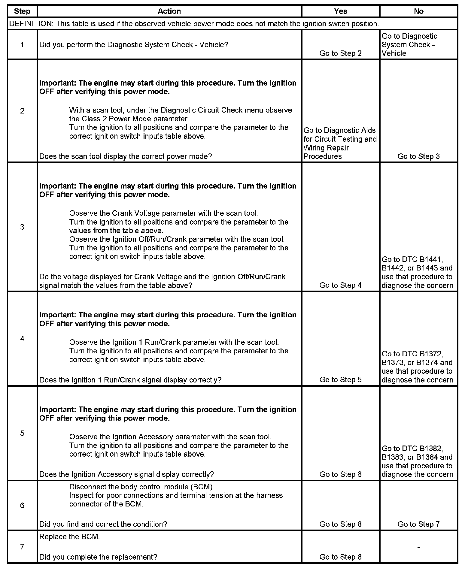 The body control module (BCM) monitors the ignition inputs Ignition Off/Run/Crank, Ignition 1 Run/Crank and the Ignition Accessory signals supplied from the ignition switch. The BCM uses the sequence that the signals appear, their voltage levels and the engine run flag (ERF) status to determine the power mode. Battery voltage is supplied to the ignition switch by the IGN TRANSD fuse. The ignition key resistor signal from the BCM provides a 5-volt supply voltage to the ignition switch. The table below shows the correct ignition switch inputs and power modes.