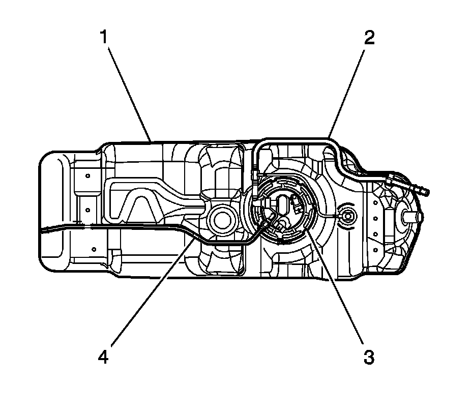The fuel pressure regulator (2) is contained in the fuel sender assembly. The fuel pressure regulator is a diaphragm relief valve. The diaphragm has fuel pressure on one side and regulator spring pressure on the other side. The fuel pressure regulator is not vacuum biased. Fuel pressure is controlled by a pressure balance across the regulator. The fuel system pressure is constant.