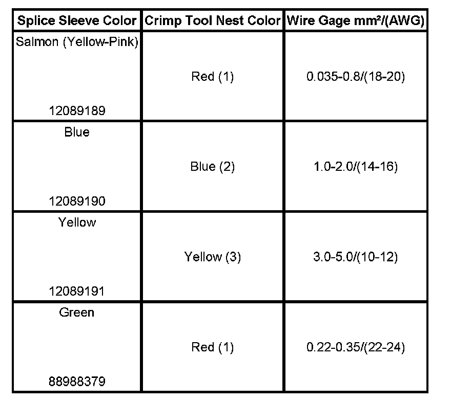 4. Select the proper DuraSeal splice sleeve according to the wire size. Refer to the above table at the beginning of the repair procedure for the color coding of the DuraSeal splice sleeves and the crimp tool nests.