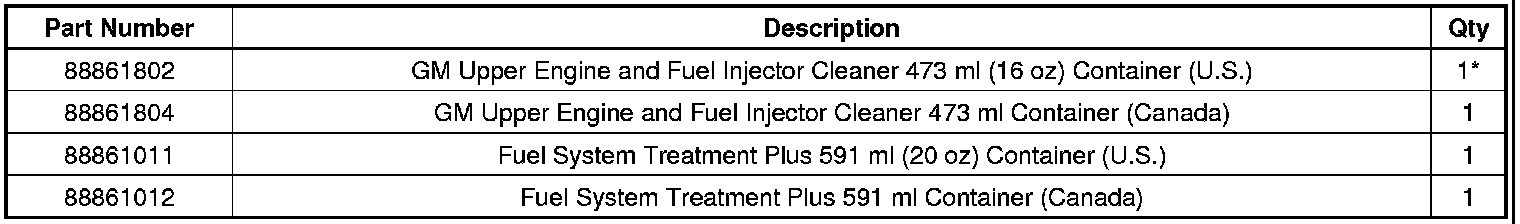 - * One bottle of GM Fuel System Treatment Plus, P/N 88861011 (in Canada, P/N 88861012)