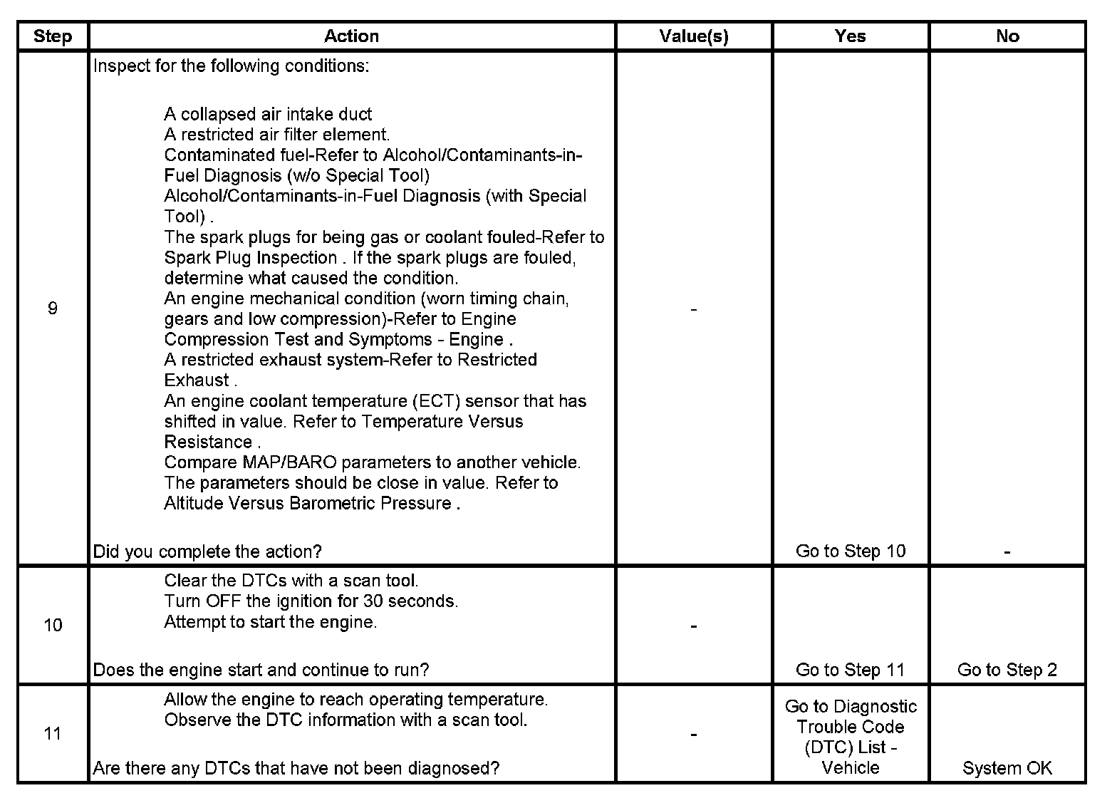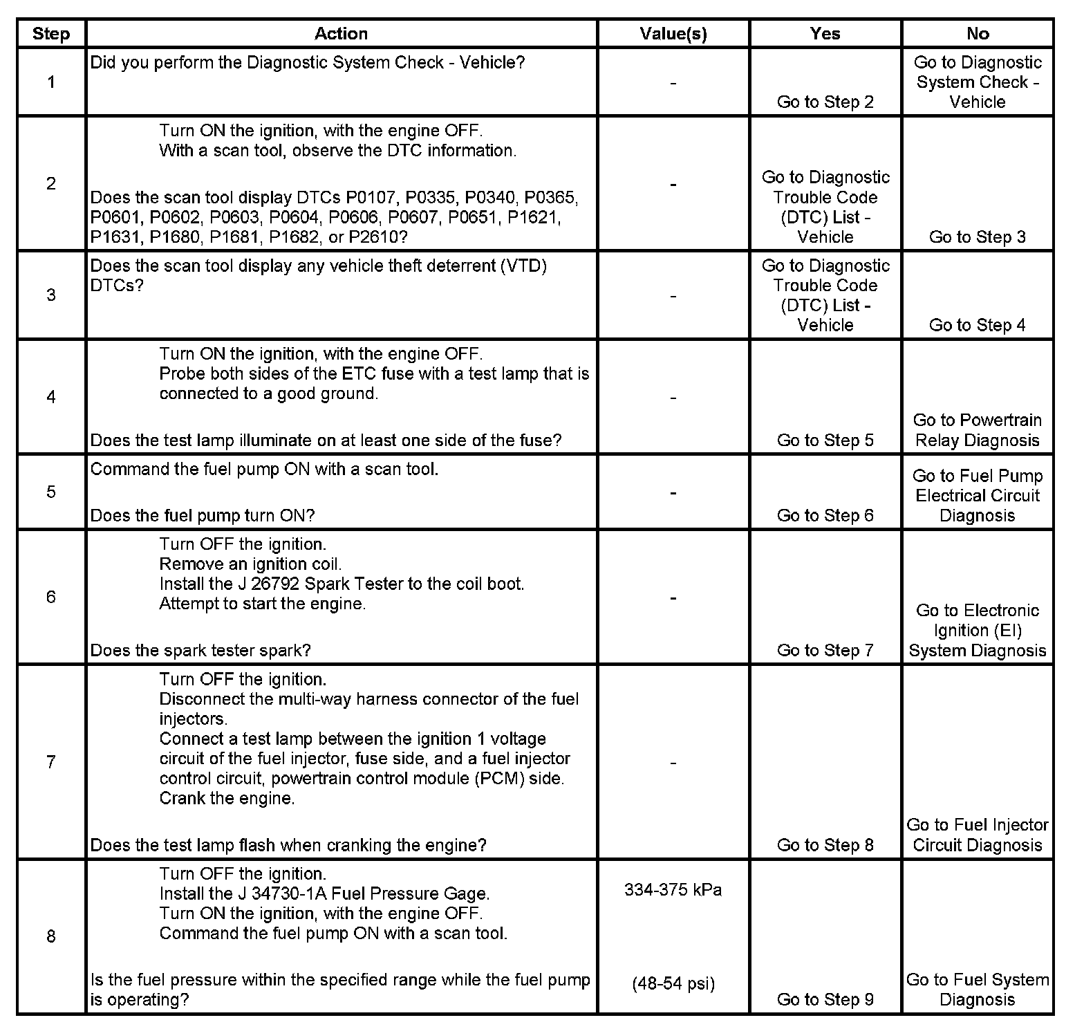 The Engine Cranks but Does Not Run diagnostic table is an organized approach to identifying a condition that causes an engine not to start. The Engine Cranks but Does Not Run diagnostic table directs the service technician to the appropriate system diagnosis.