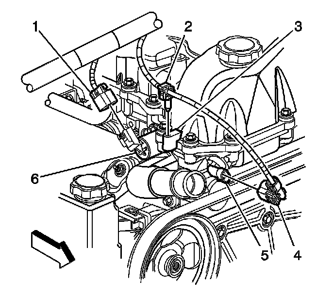 1. Disconnect the engine wiring harness electrical connector (1) from the camshaft position (CMP) actuator solenoid valve (6).