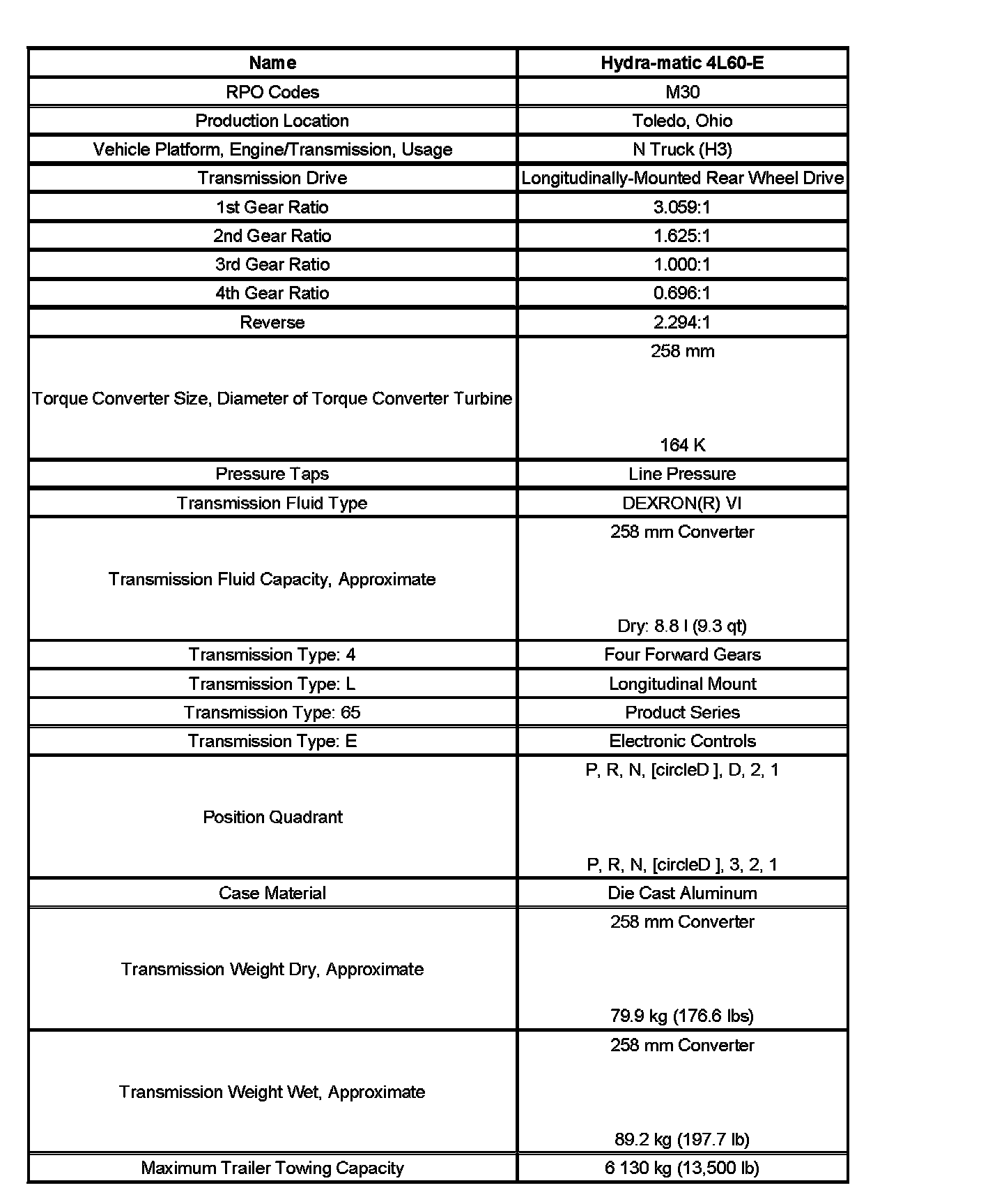 Transmission General Specifications: