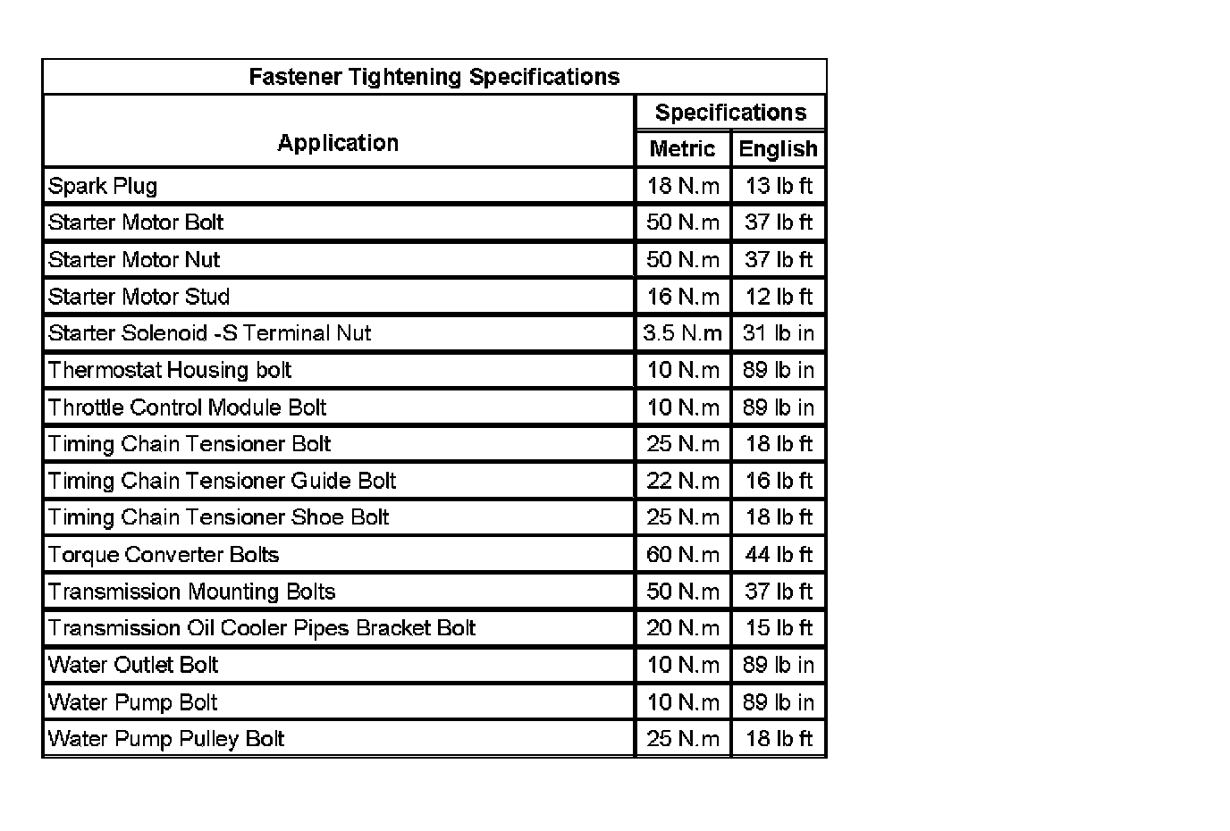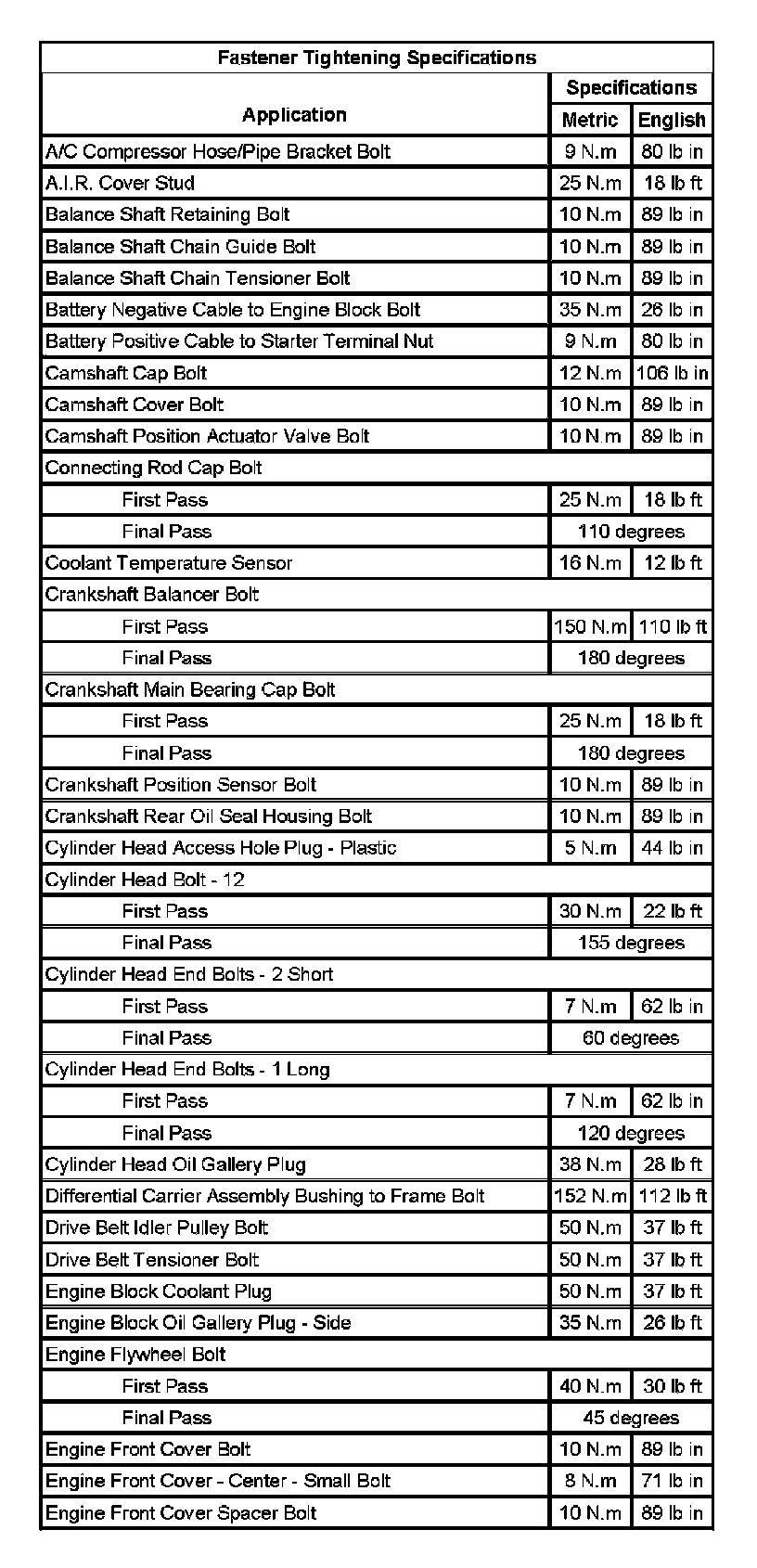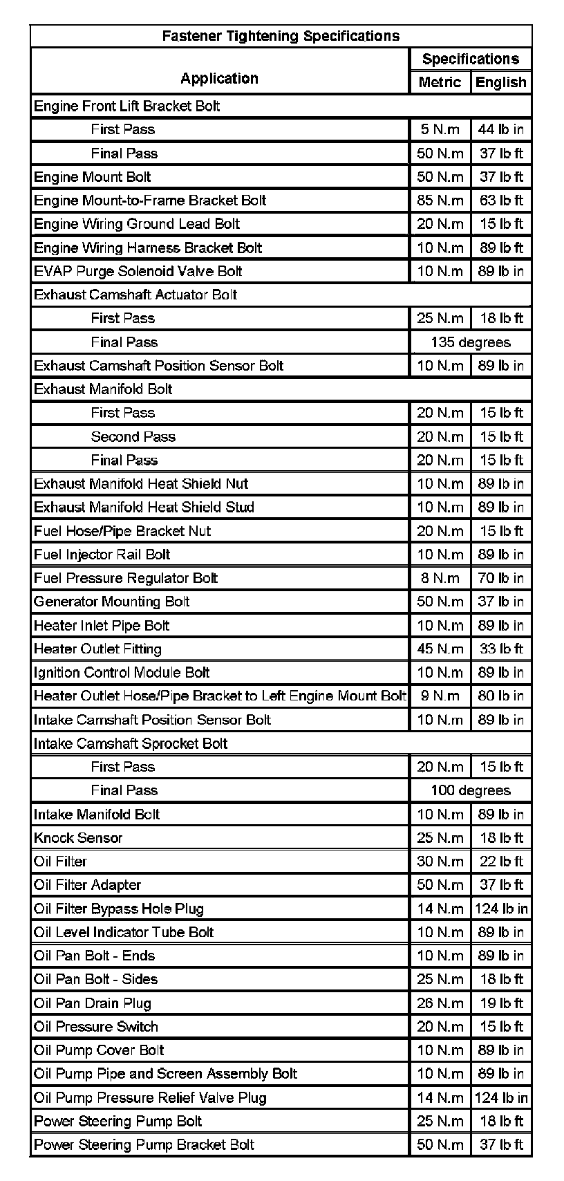 Fastener Tightening Specifications