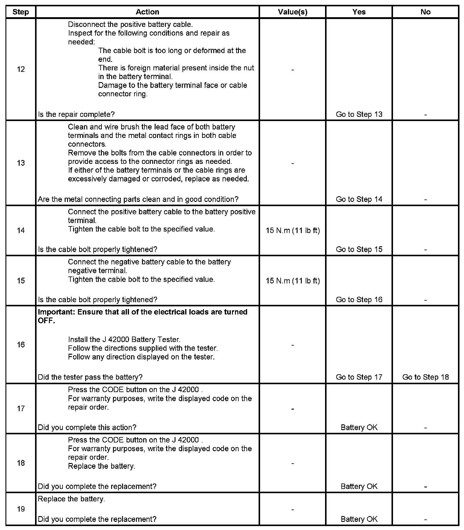 * If the tester displays a REPLACE BATTERY or BAD CELL-REPLACE result for a battery tested in the vehicle with the battery cables connected, perform the following steps: