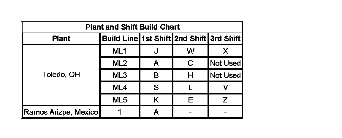 12 - Build Location Y = Toledo, OH, 4 = Ramos Arizpe, Mexico