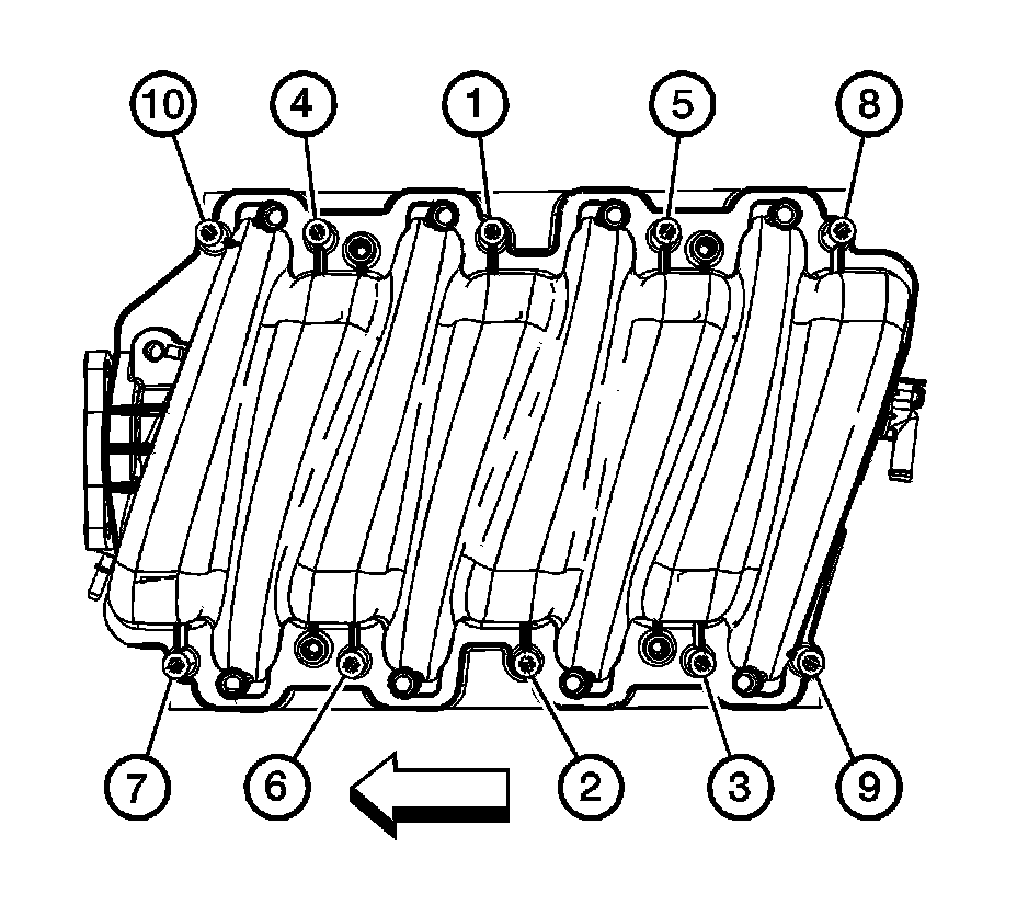 1. Tighten the intake manifold bolts (1-10) a first pass in sequence to 5 N.m (44 lb in).
