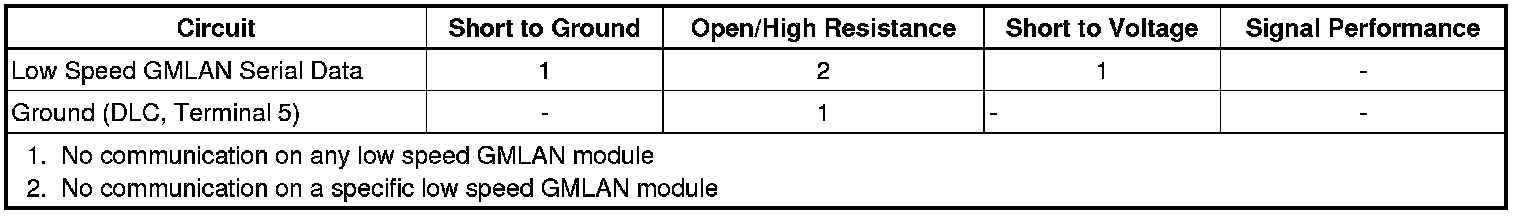 * This test is used for a total low speed GMLAN communication failure. If only 1 module is not communicating and sets no DTC, ensure that the vehicle is equipped with the module, then use DTC U0100-U0299 for diagnostics.
