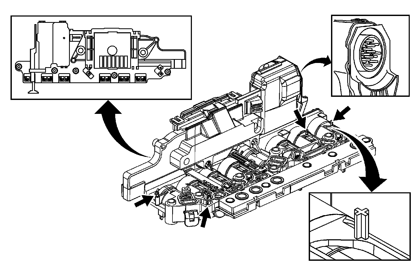 4. Inspect the 4 control solenoid (w/body and TCM) valve assembly filter plate retaining tabs (5) for cracks and ensure proper tension when filter plate is attached.