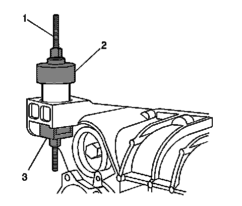 11. Install the J 45755-2 (2), J 45755-1 (3), and the forcing screw, bearing and washers (1) over the differential carrier assembly bushing as shown.