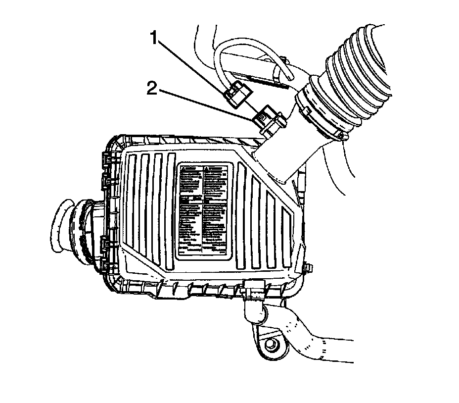 1. Disconnect the engine wiring harness electrical connector (1) from the mass air flow (MAF)/intake air temperature (IAT) sensor (2).