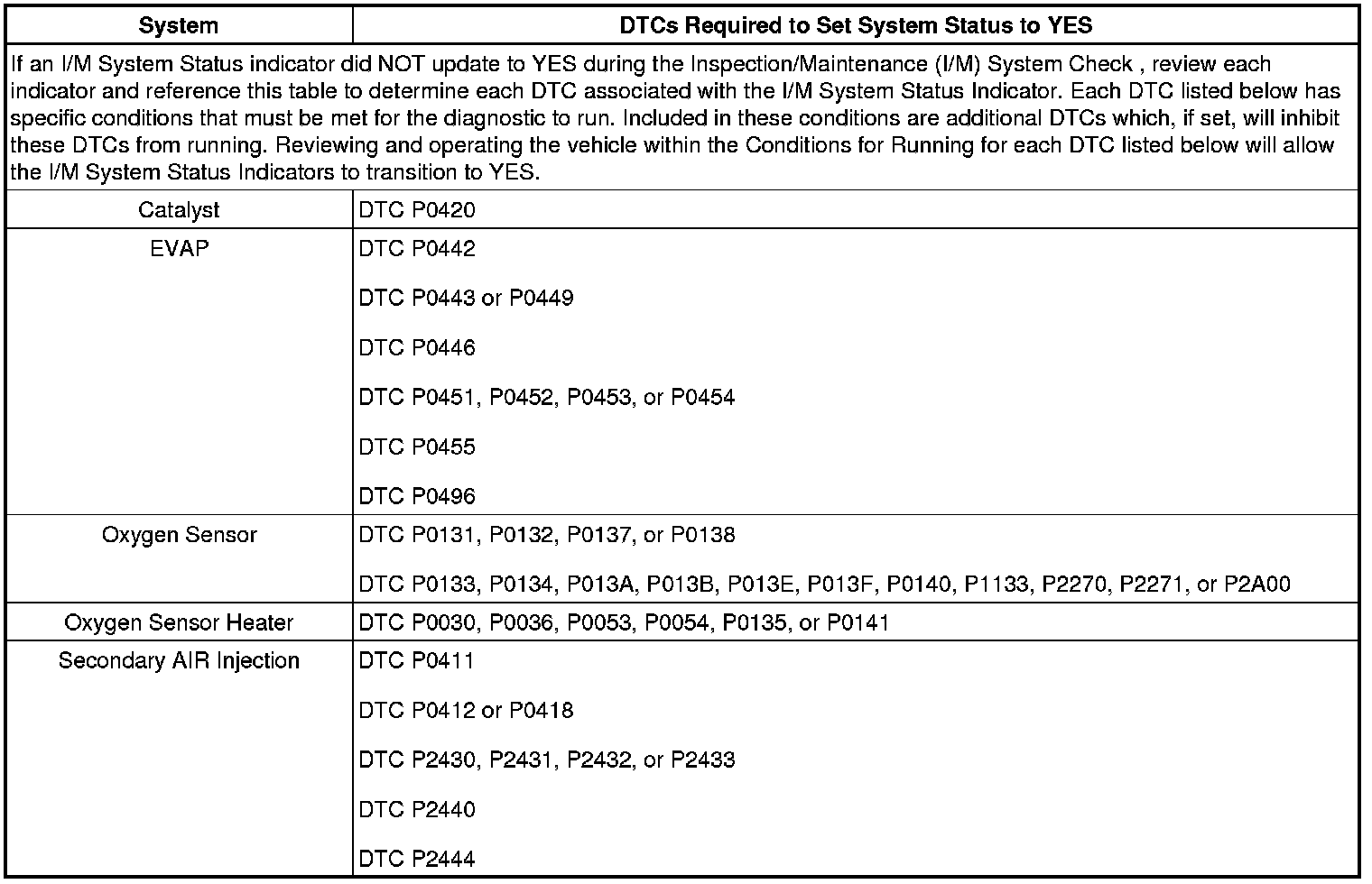 Inspection/Maintenance (I/M) System DTC Table