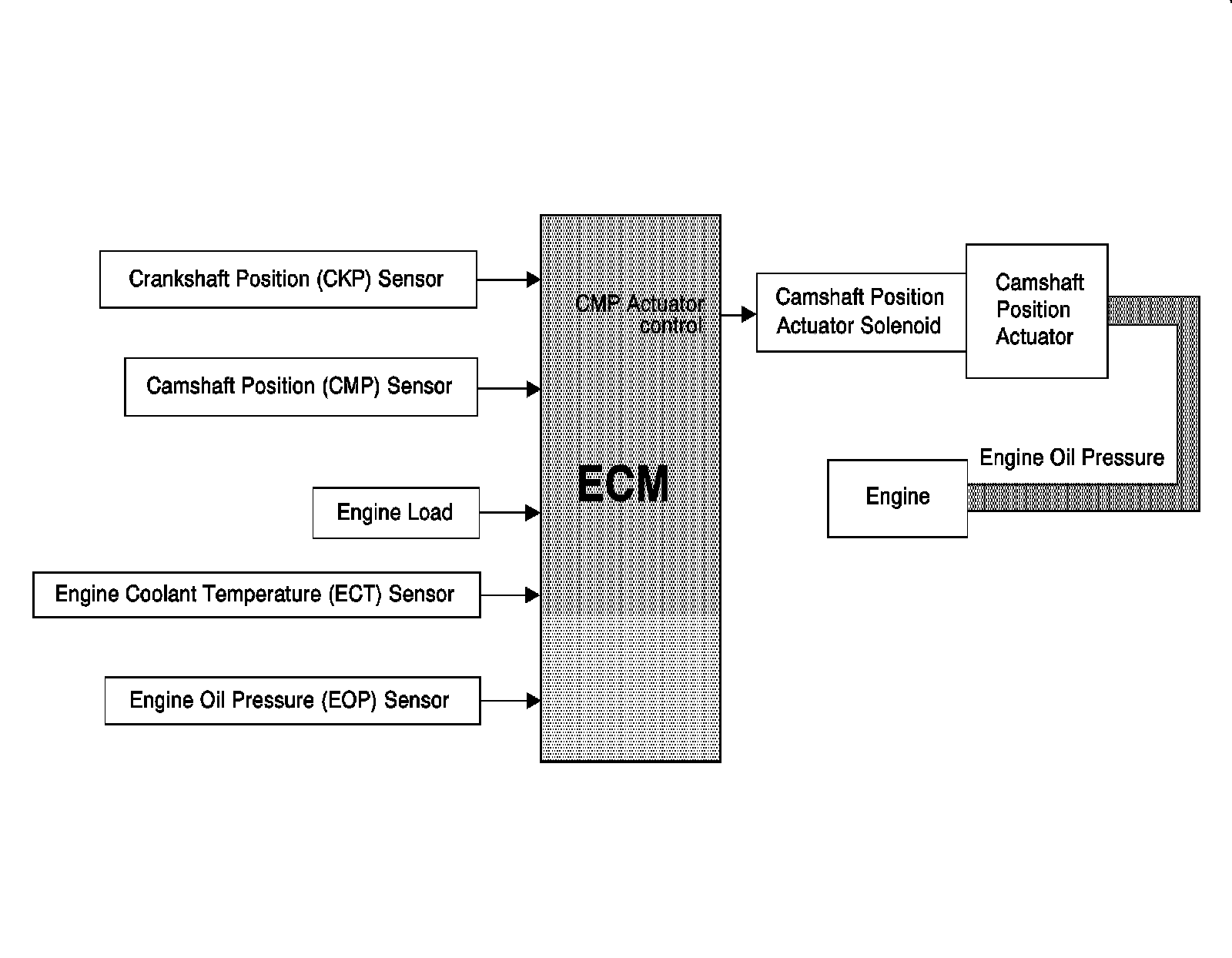 The camshaft position (CMP) actuator system is controlled by the engine control module (ECM). The ECM sends a signal to a CMP actuator solenoid in order to control the amount of engine oil flow to a Cam Actuator passage. The pressurized engine oil is sent to unseat the locking pin, and to the vane and rotor assembly of the CMP actuator. There are 2 different passages for oil to flow through, a passage for cam advance and a passage for cam retard. The Cam Actuator is attached to a camshaft and is hydraulically operated in order to change the angle of the camshaft relative to crankshaft position (CKP). Engine oil pressure (EOP), viscosity, temperature and engine oil level can have an adverse affect on Cam Actuator performance.