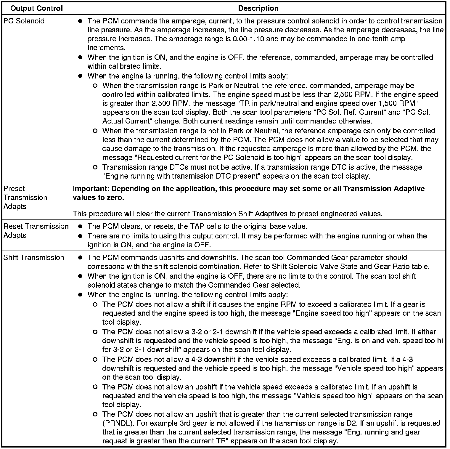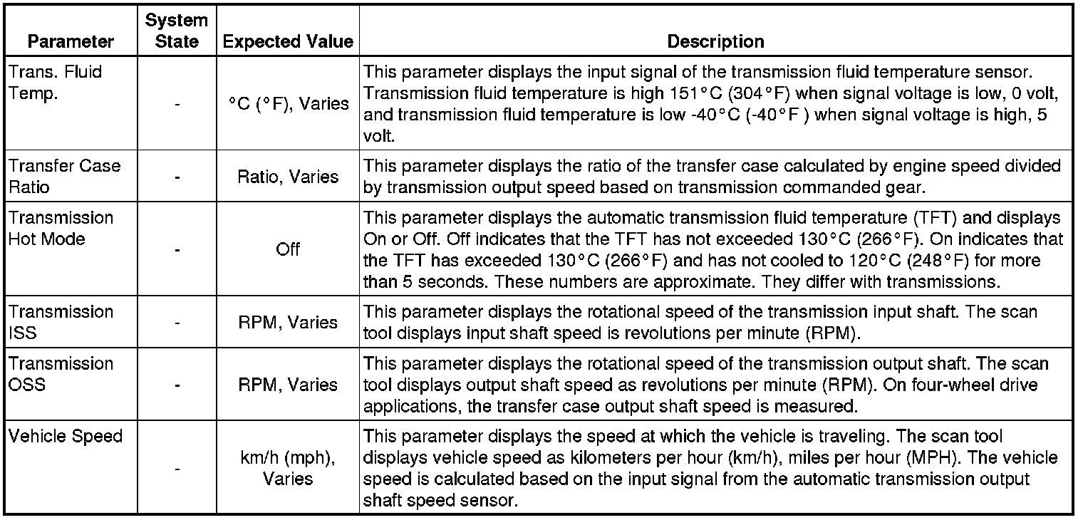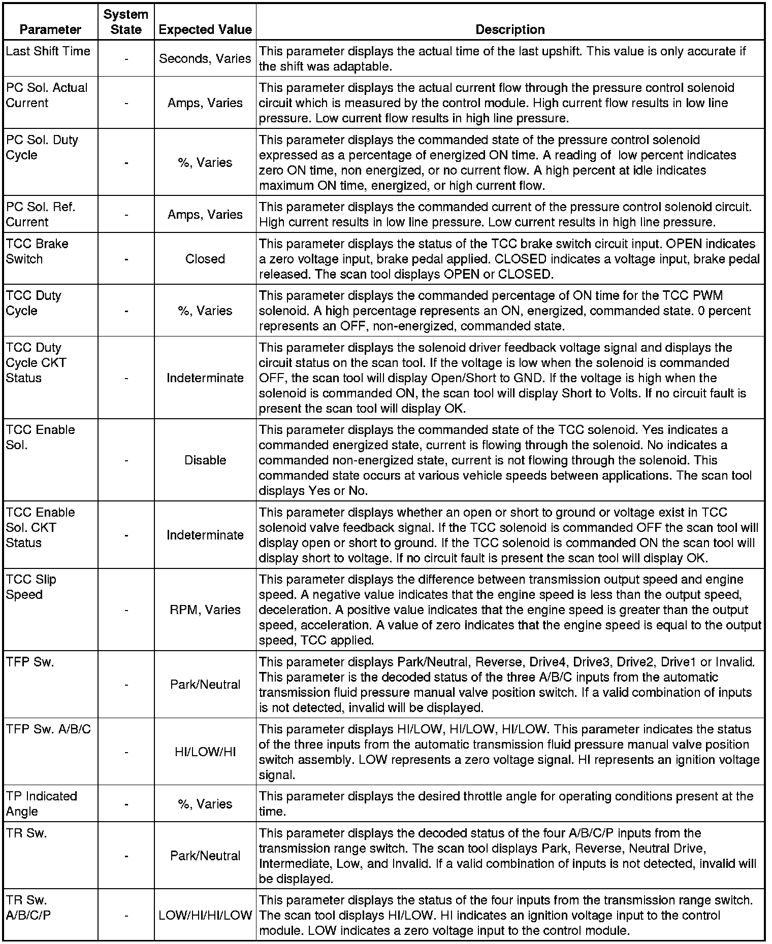 The Transmission Control Module Scan Tool Data List contains all transmission related parameters that are available on the scan tool. The list is arranged in alphabetical order. A given parameter may appear in any one of the data lists, and in some cases may appear more than once, or in more than one data list in order to group certain related parameters together.