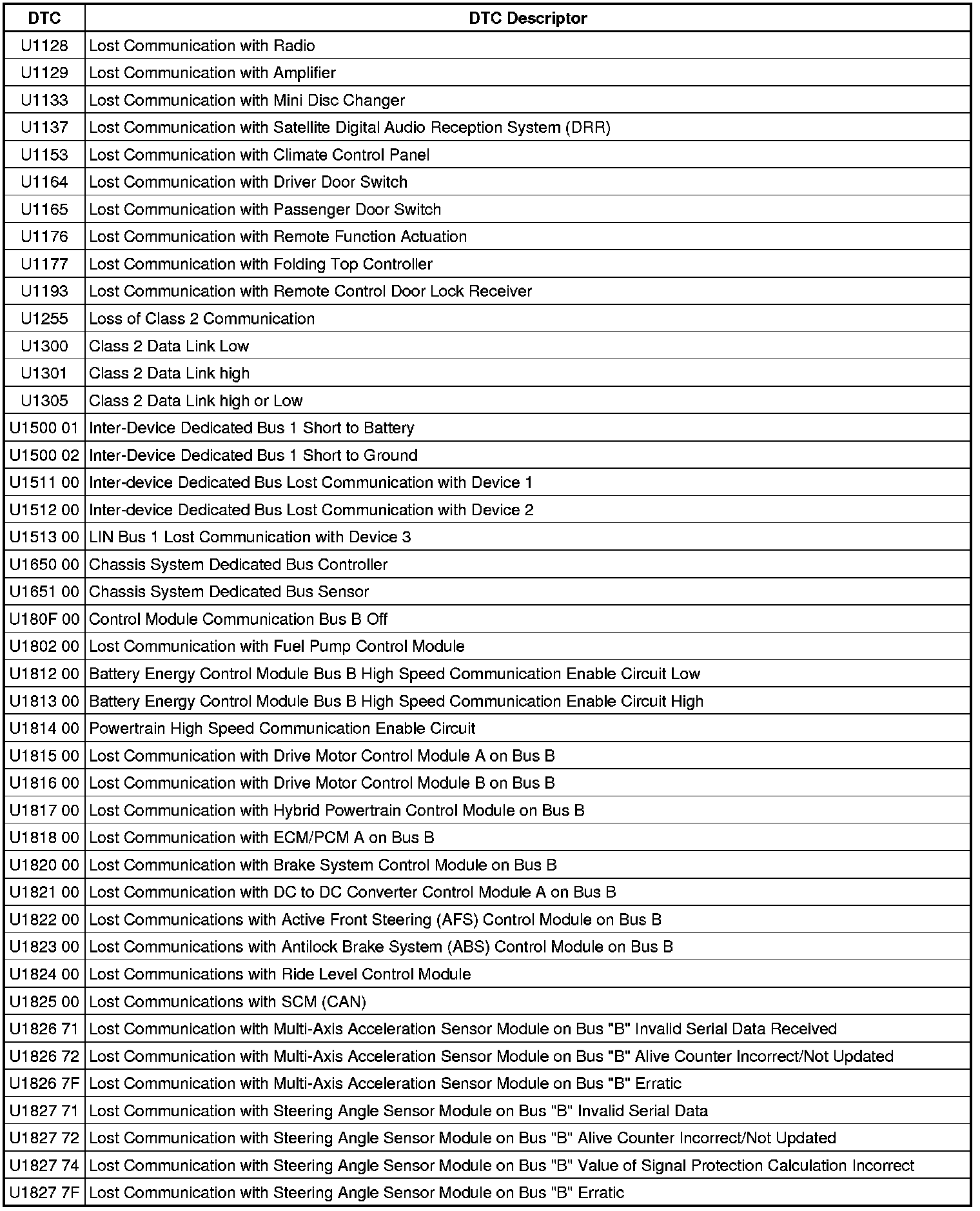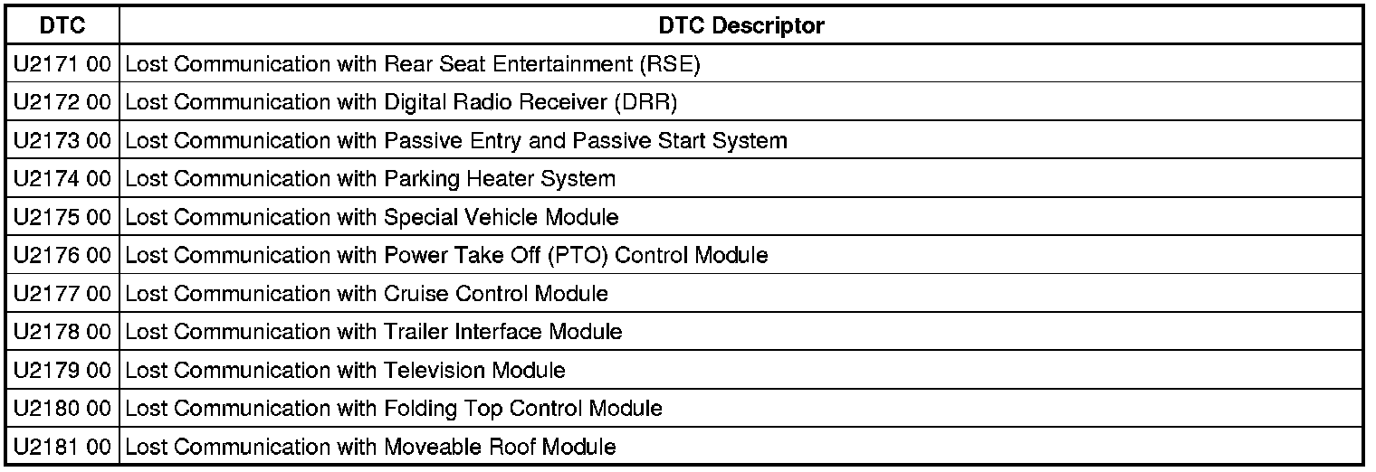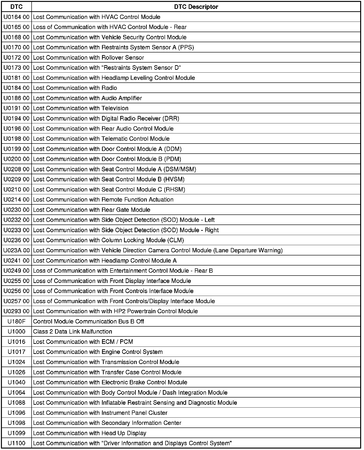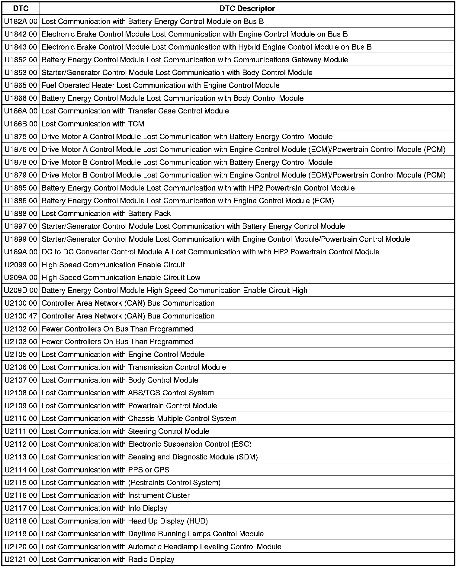 This list includes all Data Communications related U-code DTC's in alphanumeric order with descriptors for all modules. Not all DTC's listed will be applicable to all vehicles.