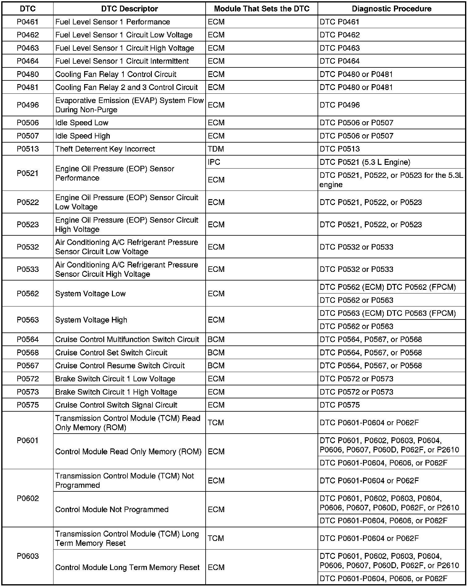 P0461 - P0603: