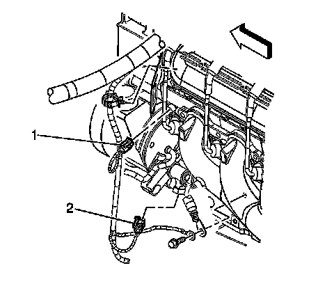 13. Remove the harness bracket nut (2) in order to remove the engine harness from the intake manifold.
