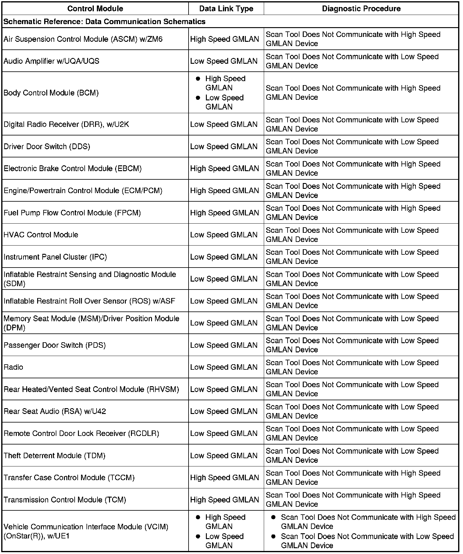 This table identifies which serial data link that a particular module uses for in-vehicle data transmission. Some modules may use more than one data link to communicate. Some modules may have multiple communication circuits passing through them without actively communicating on that data link. This table is used to assist in correcting a communication malfunction. For the description and operation of these serial data communication circuits refer to Data Link Communications Description and Operation (Description and Operation).