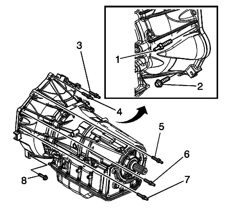 6. Install the bolts and studs (1-8) securing the transmission to the engine.