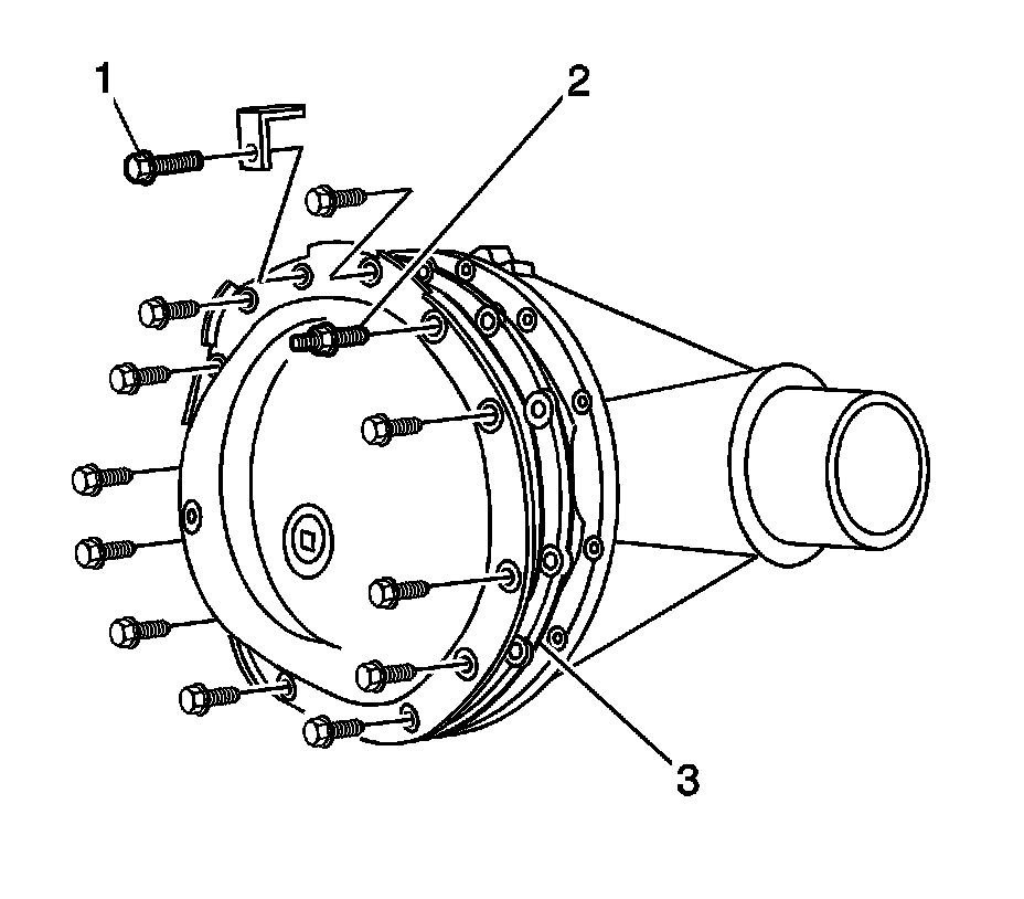 1. Install the gasket (3) and the rear axle housing cover.