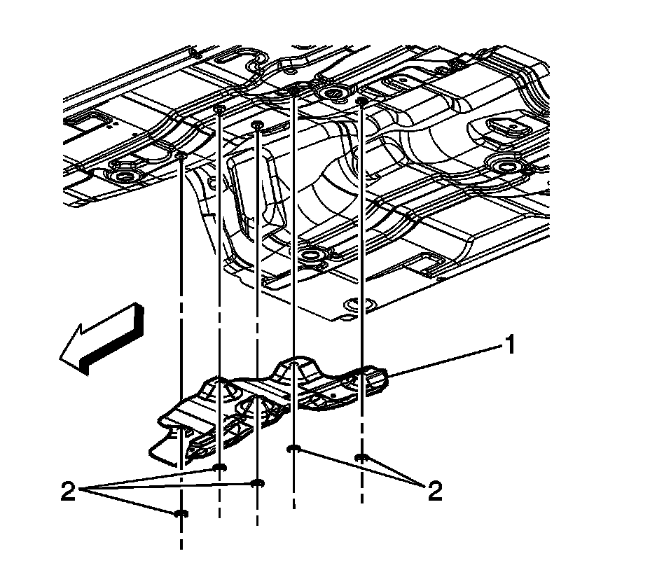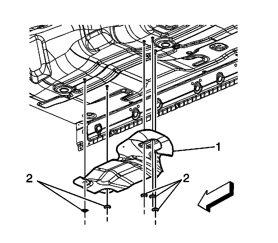 1. If equipped with a 5.3L engine, position the catalytic converter heat shield (1) to the underbody and install the nuts (2).