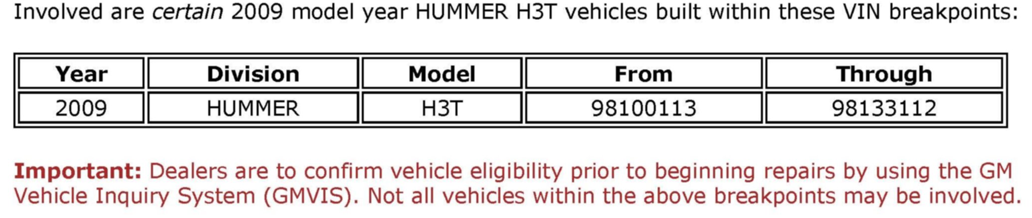 General Motors has decided that a defect, which relates to motor vehicle safety, exists in certain 2009 model year HUMMER H3T vehicles. Some of these vehicles have a condition in which the fuel tank front support strap may fracture. If this occurs, the fuel tank would be supported by the rear support strap and fuel tank shield only. Continued use of the vehicle may eventually fracture the rear support strap and shield. If this were to occur, the fuel tank could separate from the vehicle, resulting in a possible under-vehicle fire.