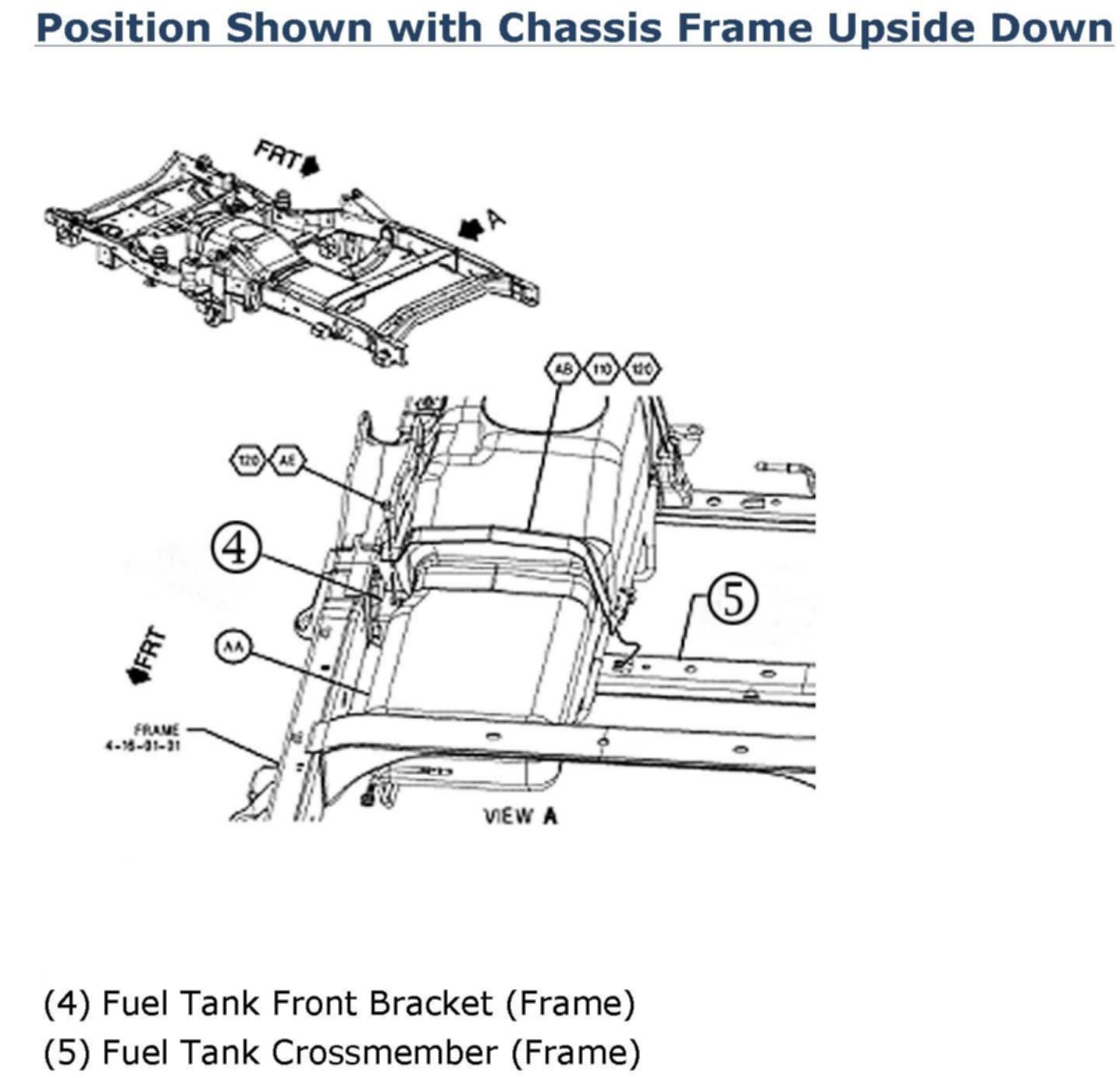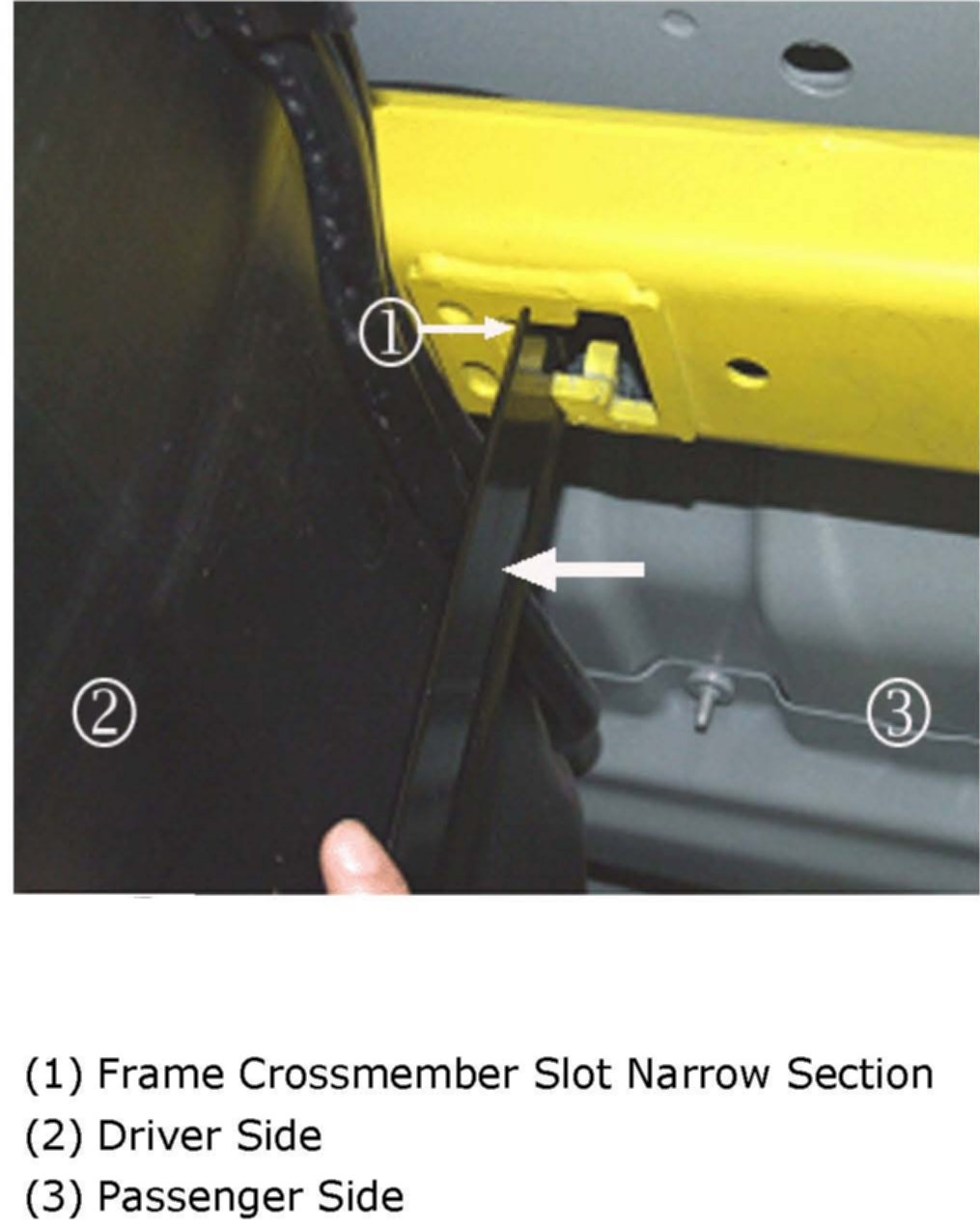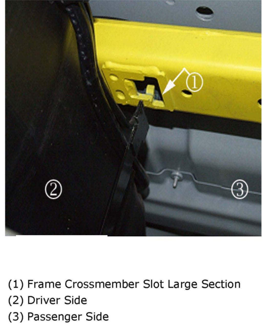 8.3. Move the new fuel tank front strap towards the driver side of the vehicle until it touches the frame crossmember slot narrow section edge.