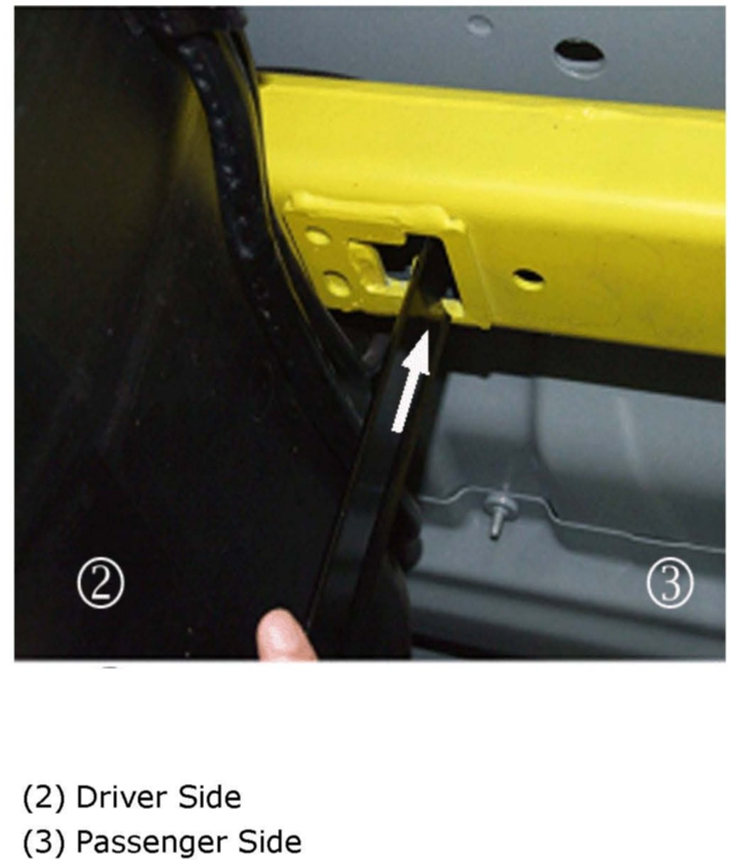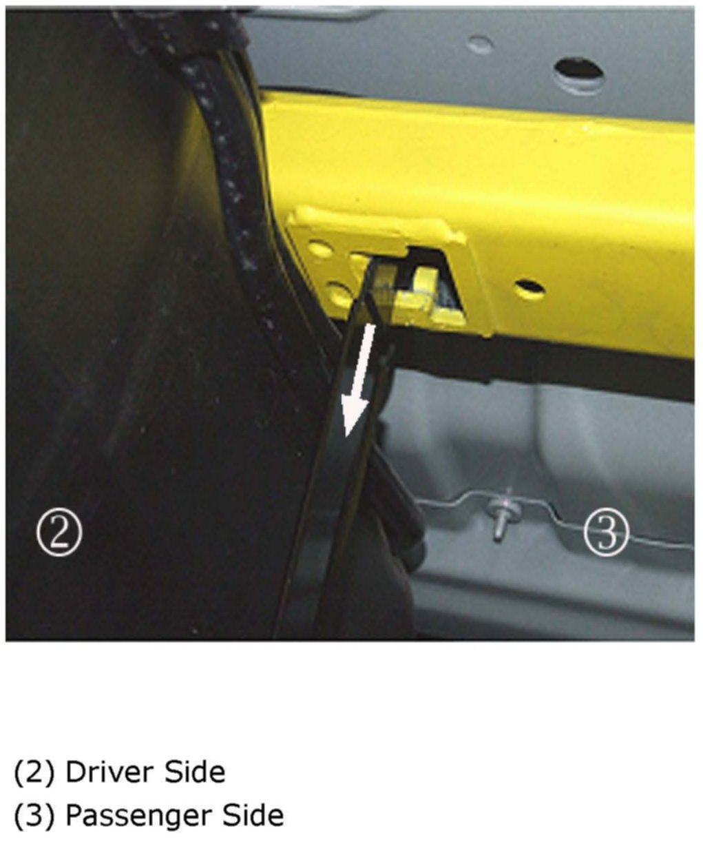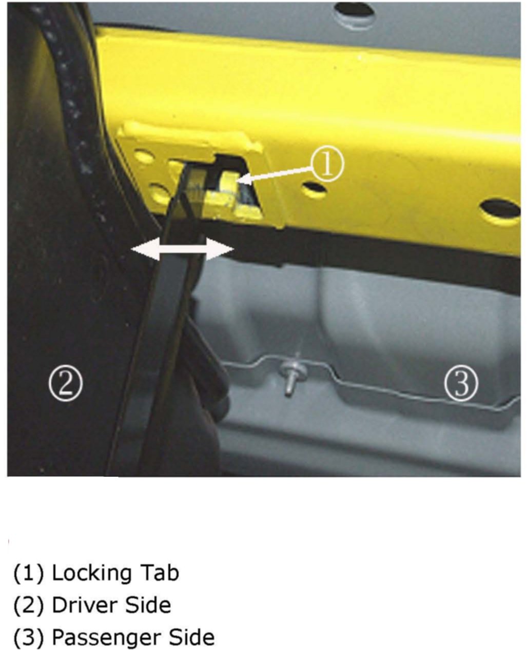 8.5. VERIFICATION: pulling the strap down (position shown in Step 8.4), move the strap side to side (passenger side-driver side-passenger side). The strap will be located on the driver side of the locking tab.