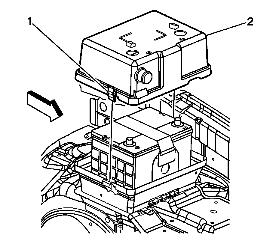 9. Install the engine wiring harness clip (2) to the upper battery box.