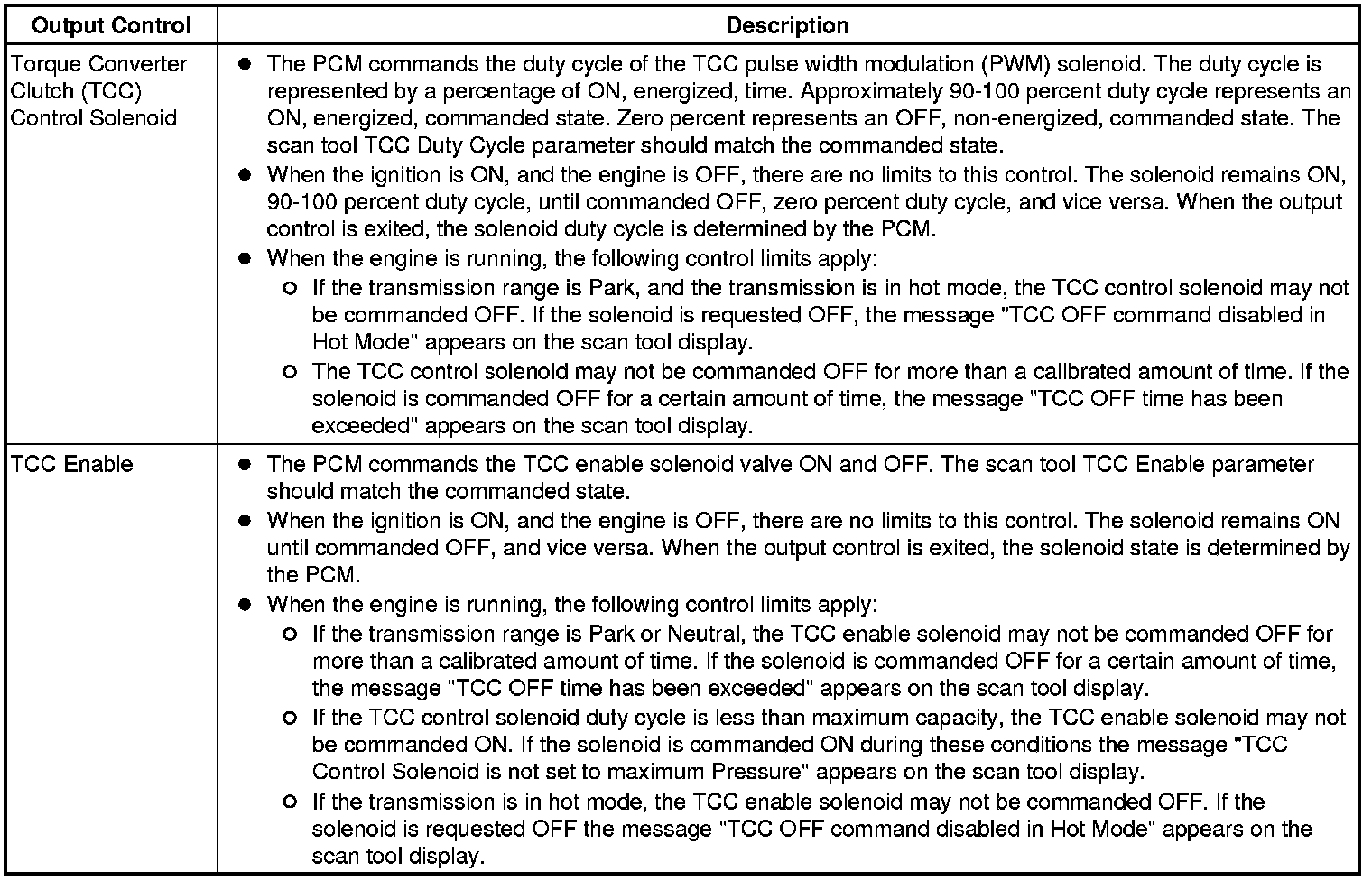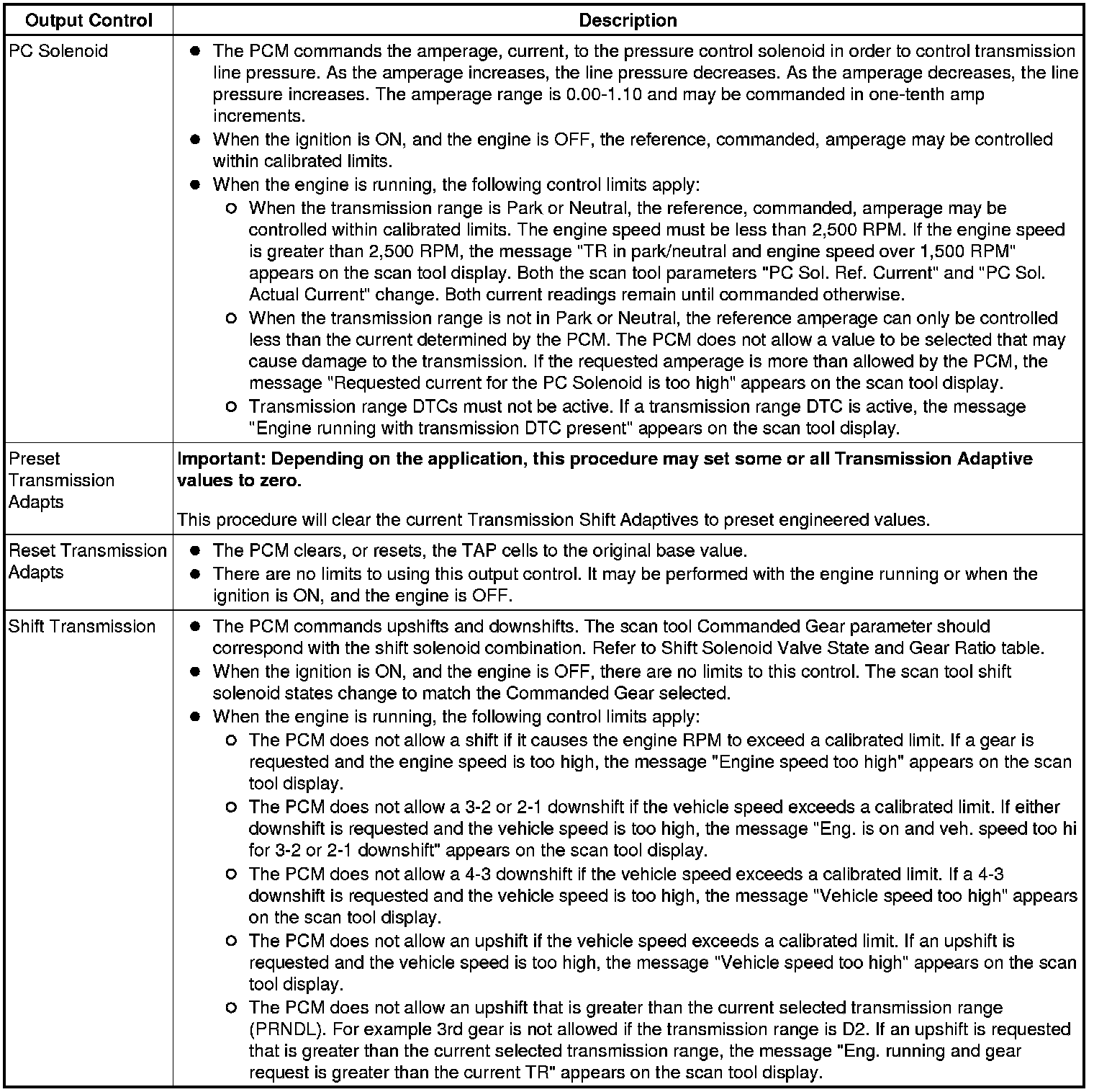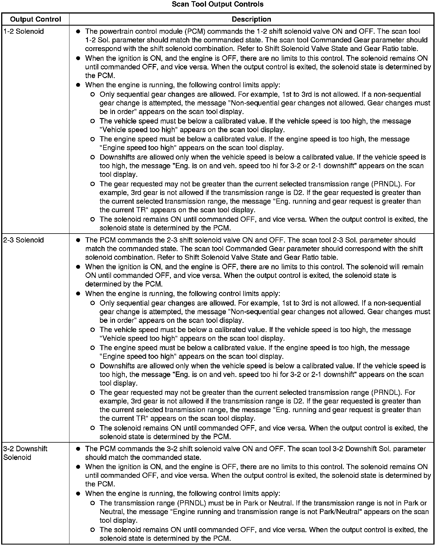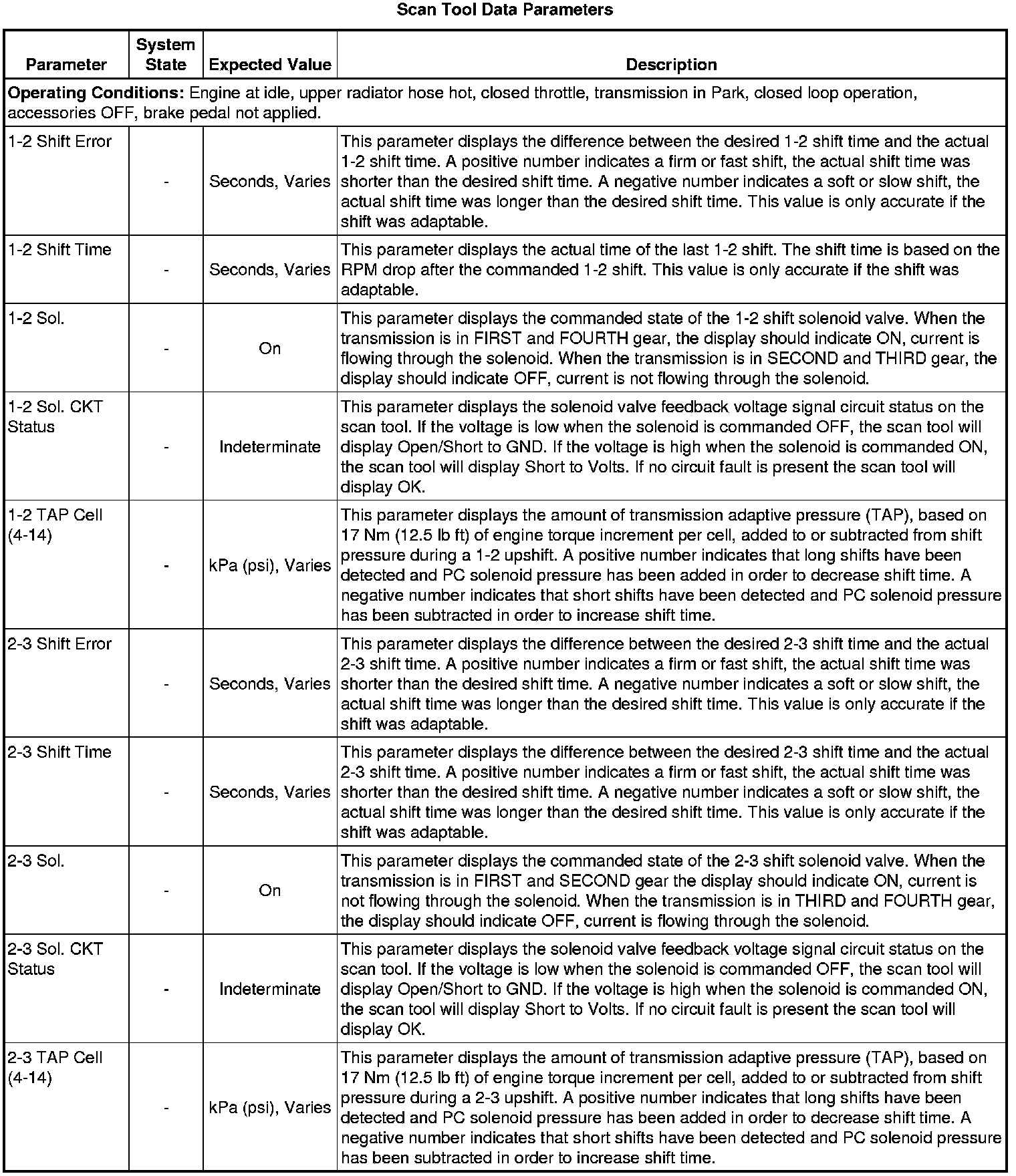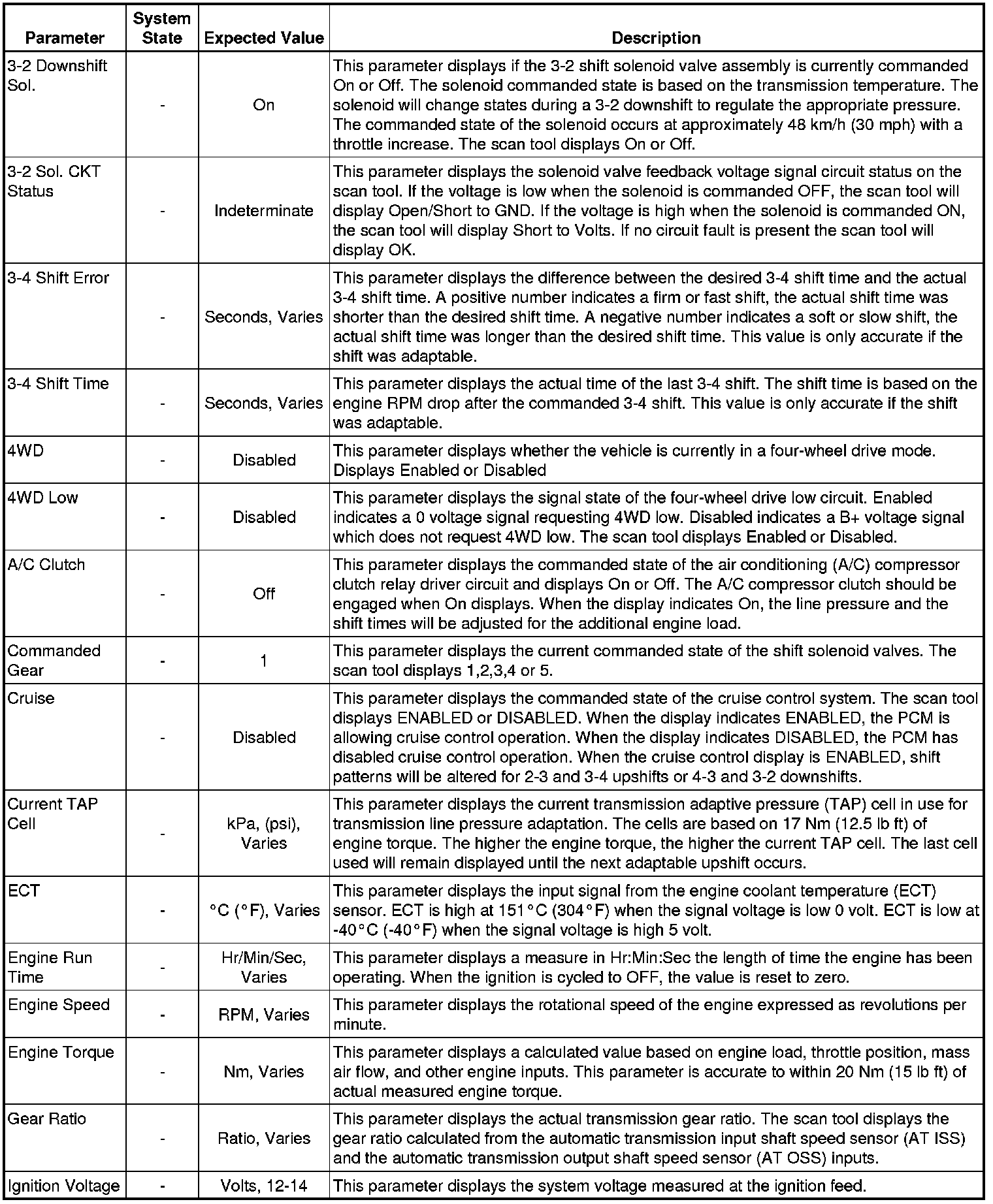 The Transmission Control Module Scan Tool Data List contains all transmission related parameters that are available on the scan tool. The list is arranged in alphabetical order. A given parameter may appear in any one of the data lists, and in some cases may appear more than once, or in more than one data list in order to group certain related parameters together.