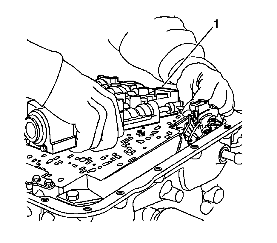 5. Install the valve body (1) over the J 25025-5 - mounting post , and connect the manual valve link to the manual valve.