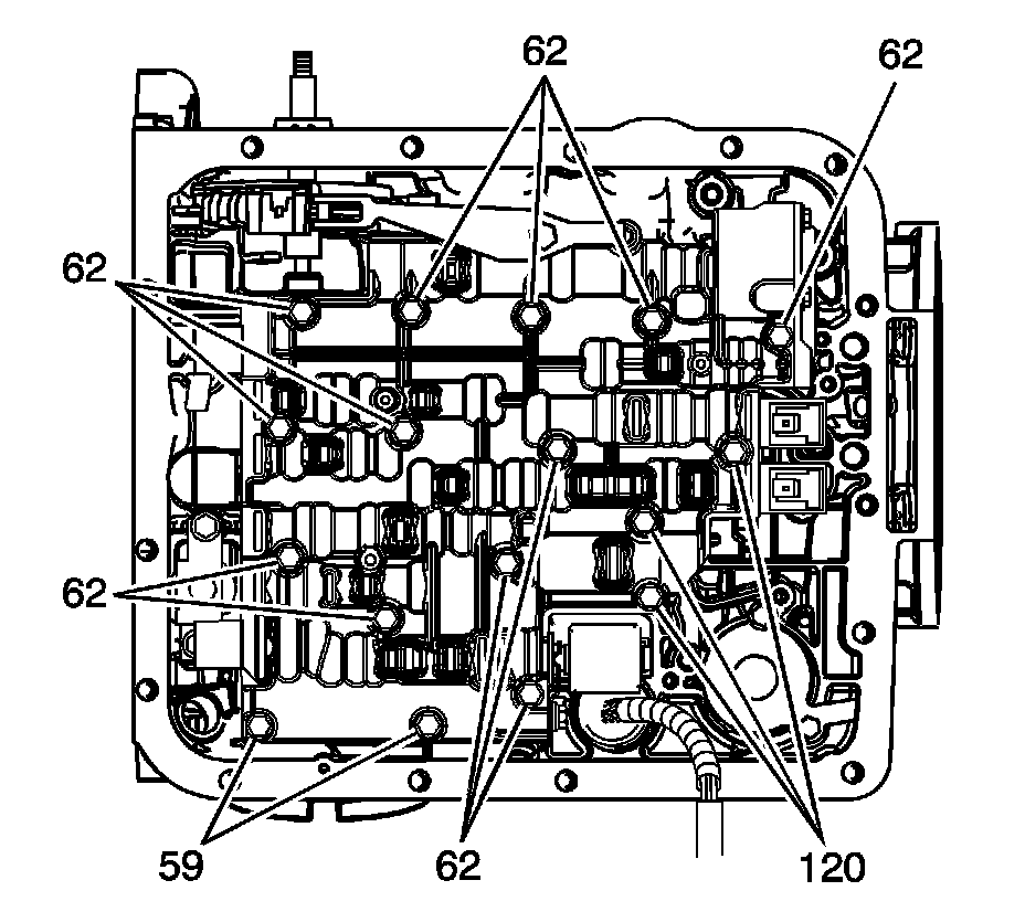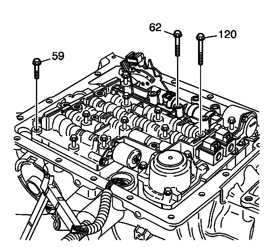 8. Install the 12 valve body bolts (62), 2 bolts (59) and 3 bolts (120) that are shown only.