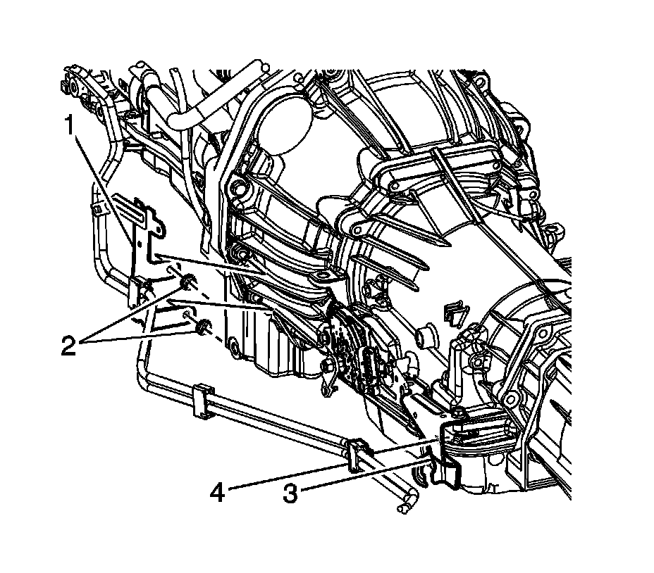 16. Connect the transmission vent hose retainer (1) to the heater pipe bracket (2).