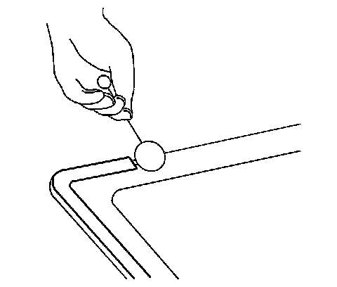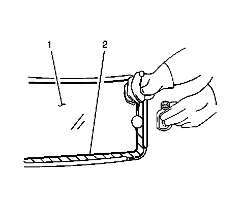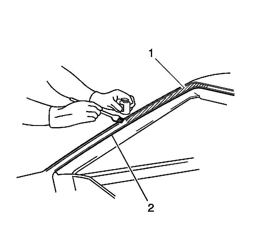 Note: Do not apply the black number 3 primer to the existing bead (1) of the urethane adhesive on the pinch-weld flange. Apply the primer only to nicks, scratches or the primed surfaces.