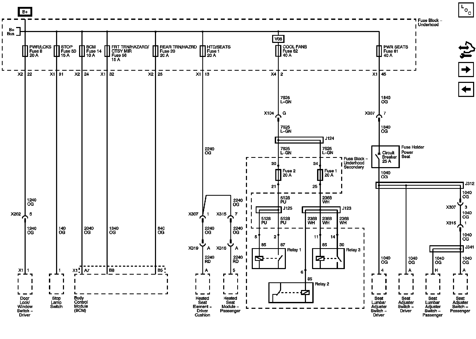 BCM, COOL FANS, FRT TRN/HAZRD/CTSY MIR, HTD/SEATS, PWR/LKS, PWR SEATS, REAR TRN/HAZRD, and STOP Fuses