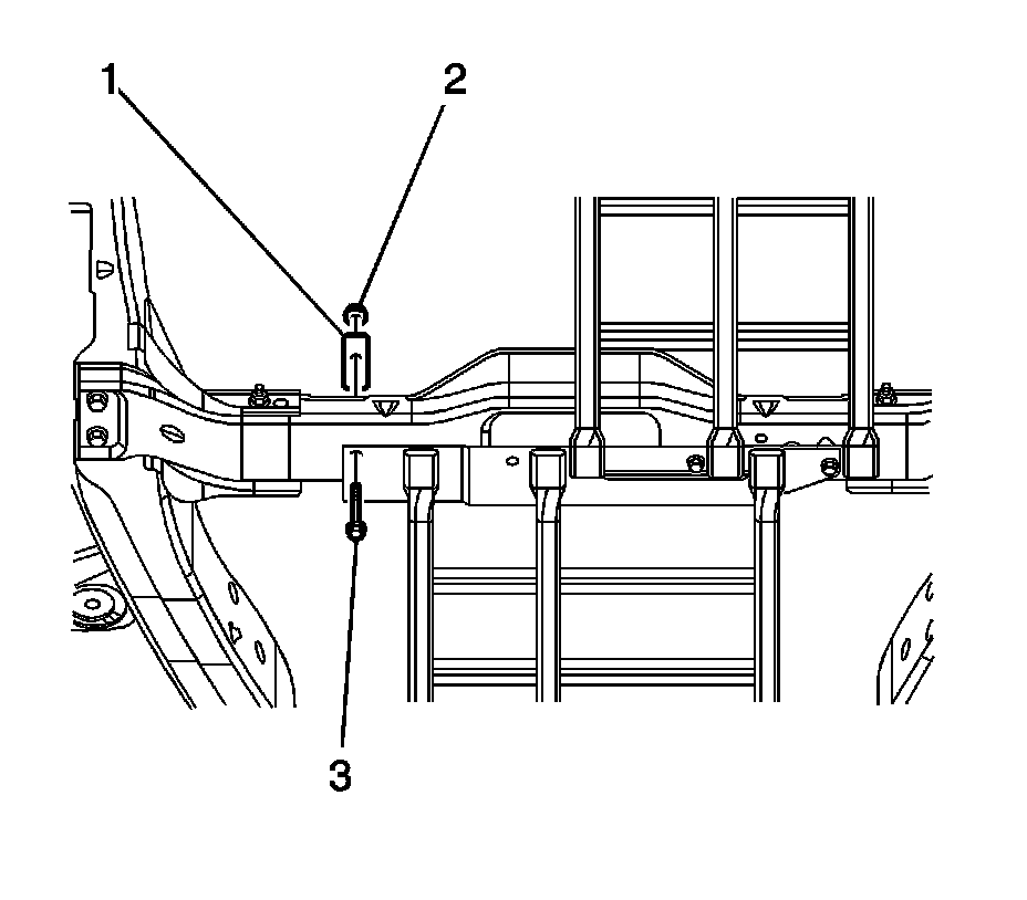 7. Install the spacer (1), bolt (3), and nut (2) securing the front catalytic converter guard to the transmission support.