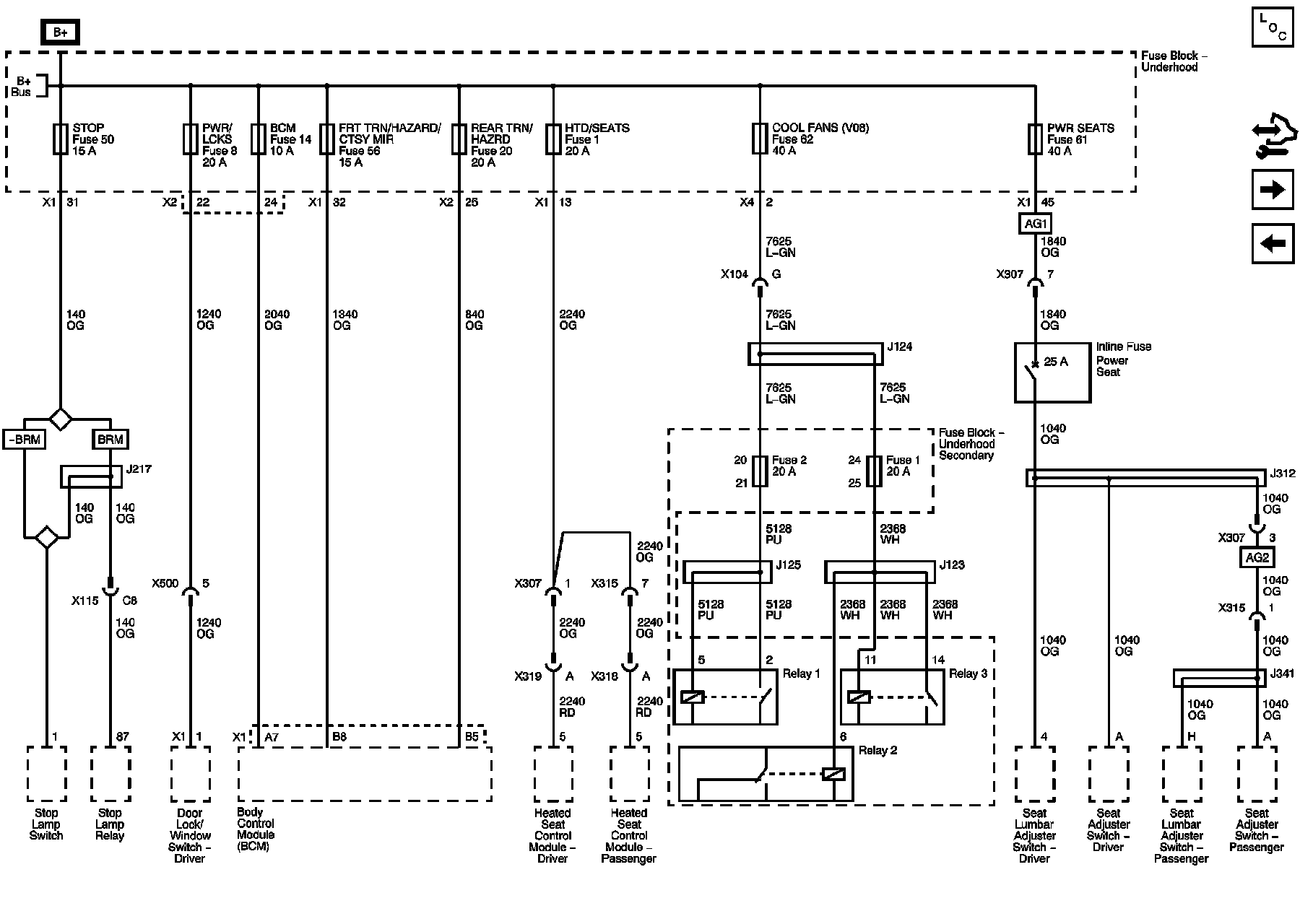BCM, COOL FANS (V08), FRT TRN/HAZRD/CTSY MIR, HTD/SEATS, PWR/LKS, PWR SEATS, REAR TRN/HAZRD, and STOP Fuses