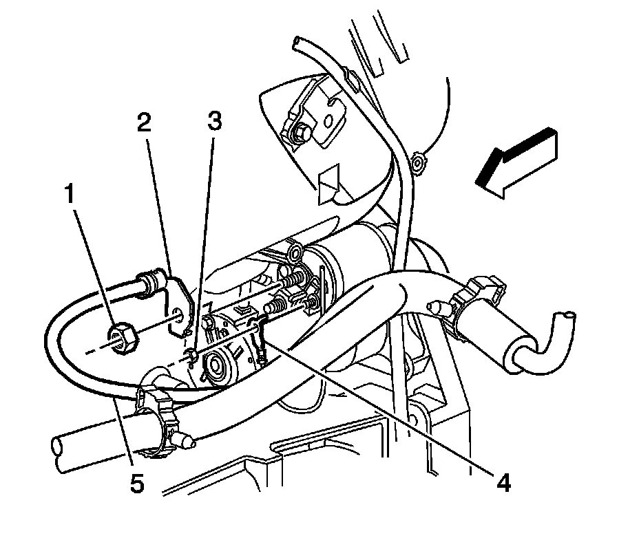 35. Position the J 38185 (2) to the clamp (1) in order to connect the heater outlet hose to the heater outlet hose fitting (3).