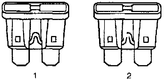 The fuse is the most common method of an automotive wiring circuit protection. Whenever there is an excessive amount of current flowing through a circuit the fusible element will melt and create an open or incomplete circuit. Fuses are a one time protection device and must be replaced each time the circuit is overloaded. To determine if a fuse is open, remove the suspected fuse and examine if the element in the fuse is broken (2). If not broken (1), also check for continuity using a Digital Multimeter (DMM) or a continuity tester. If the element is broken or continuity is suspect, replace the fuse with one of equal current rating.